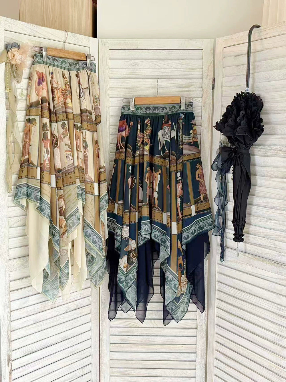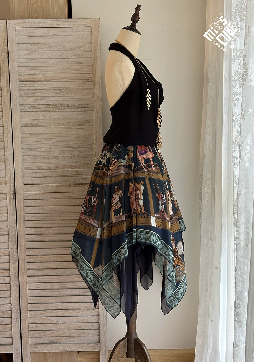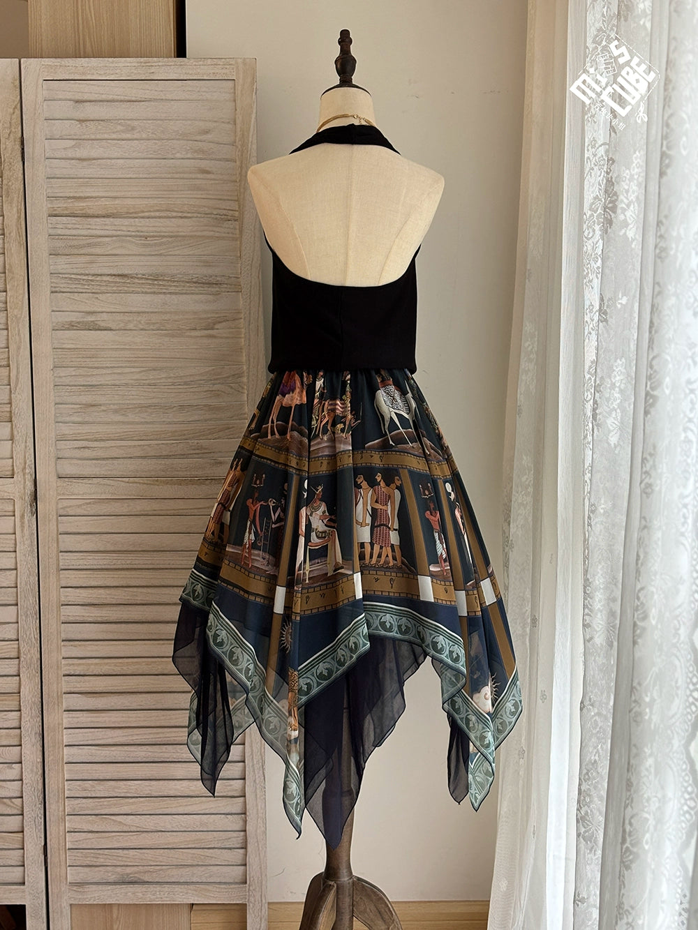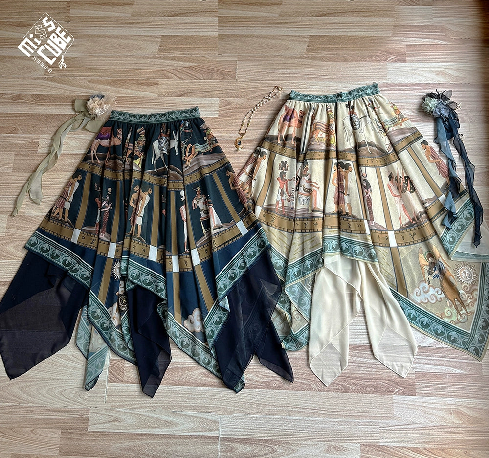 エジプト風のプリントが個性的なスカート。イレギュラーな裾のデザインで軽やかな雰囲気に。