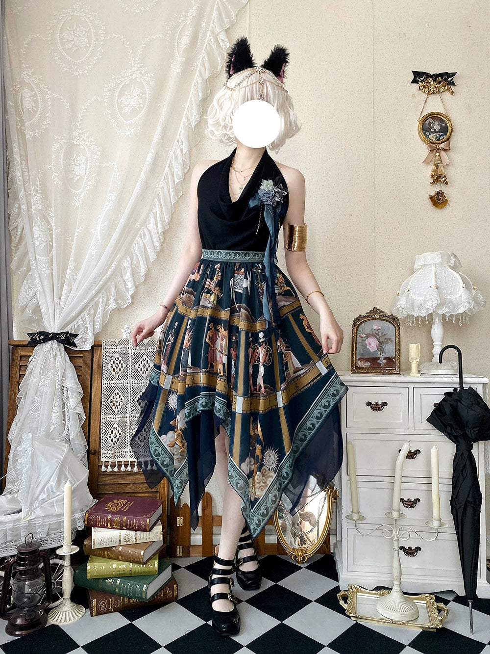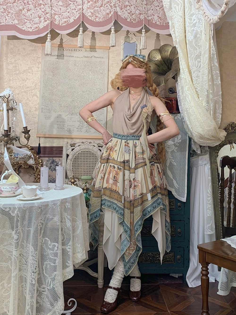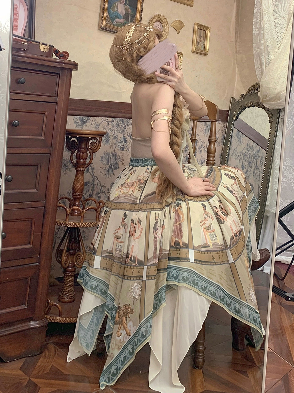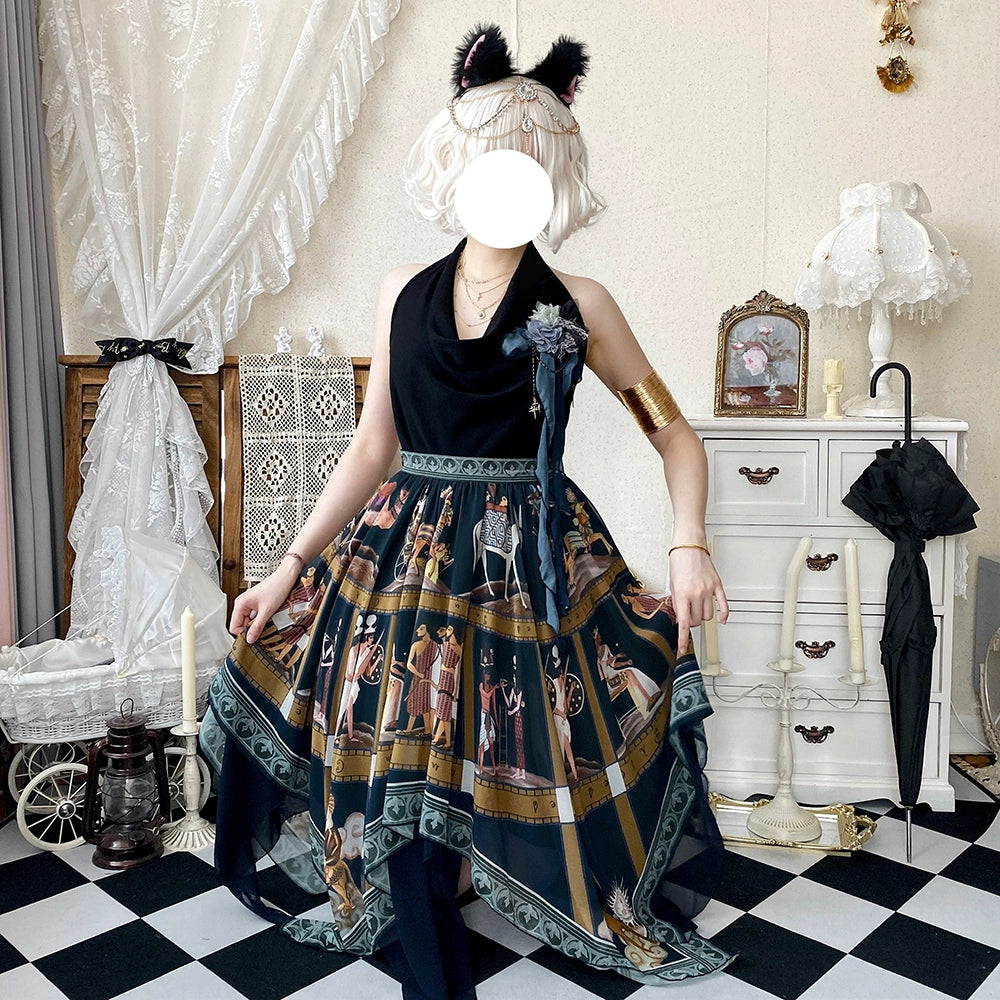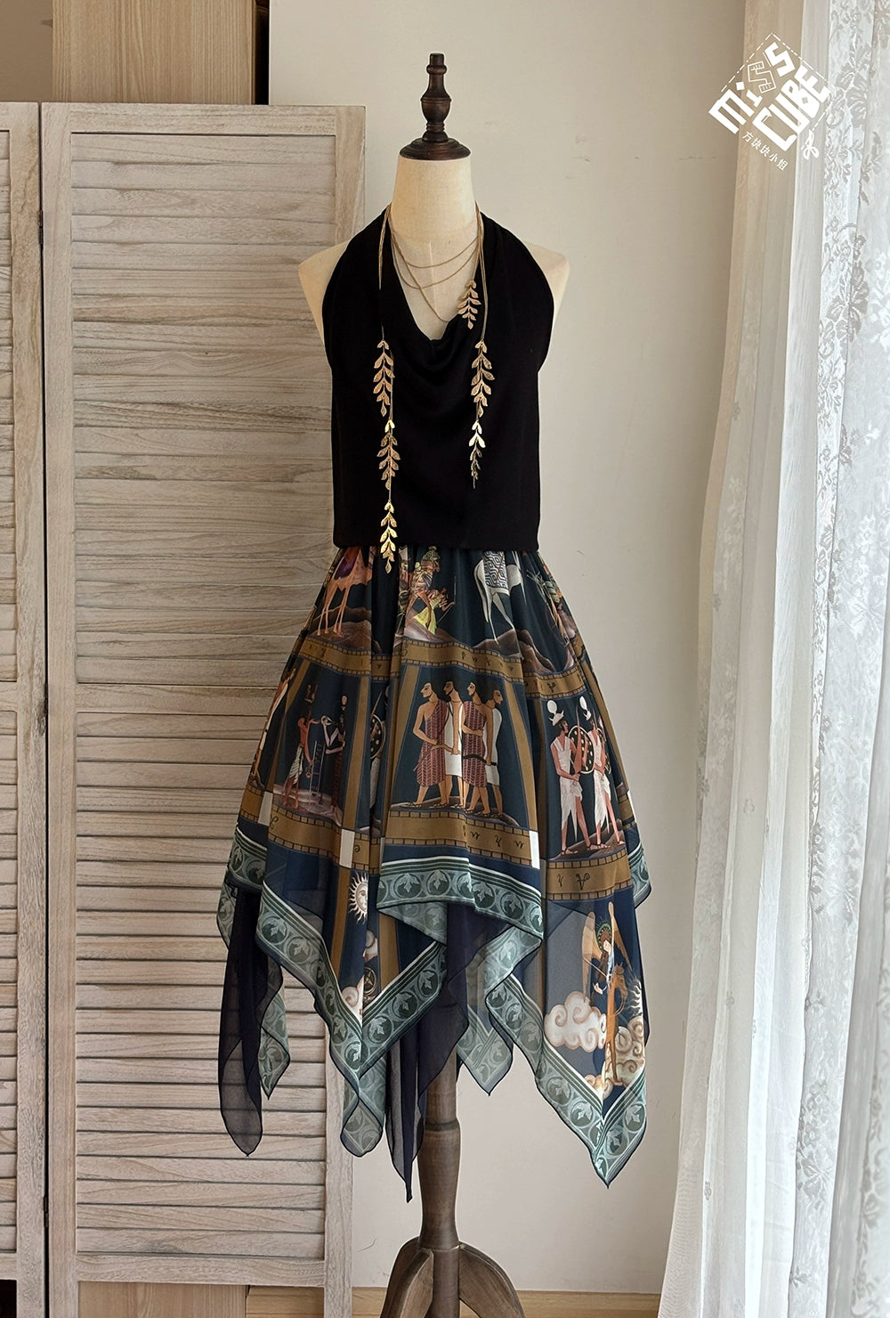 エジプト風のプリントが個性的なスカート。イレギュラーな裾のデザインで軽やかな雰囲気に。