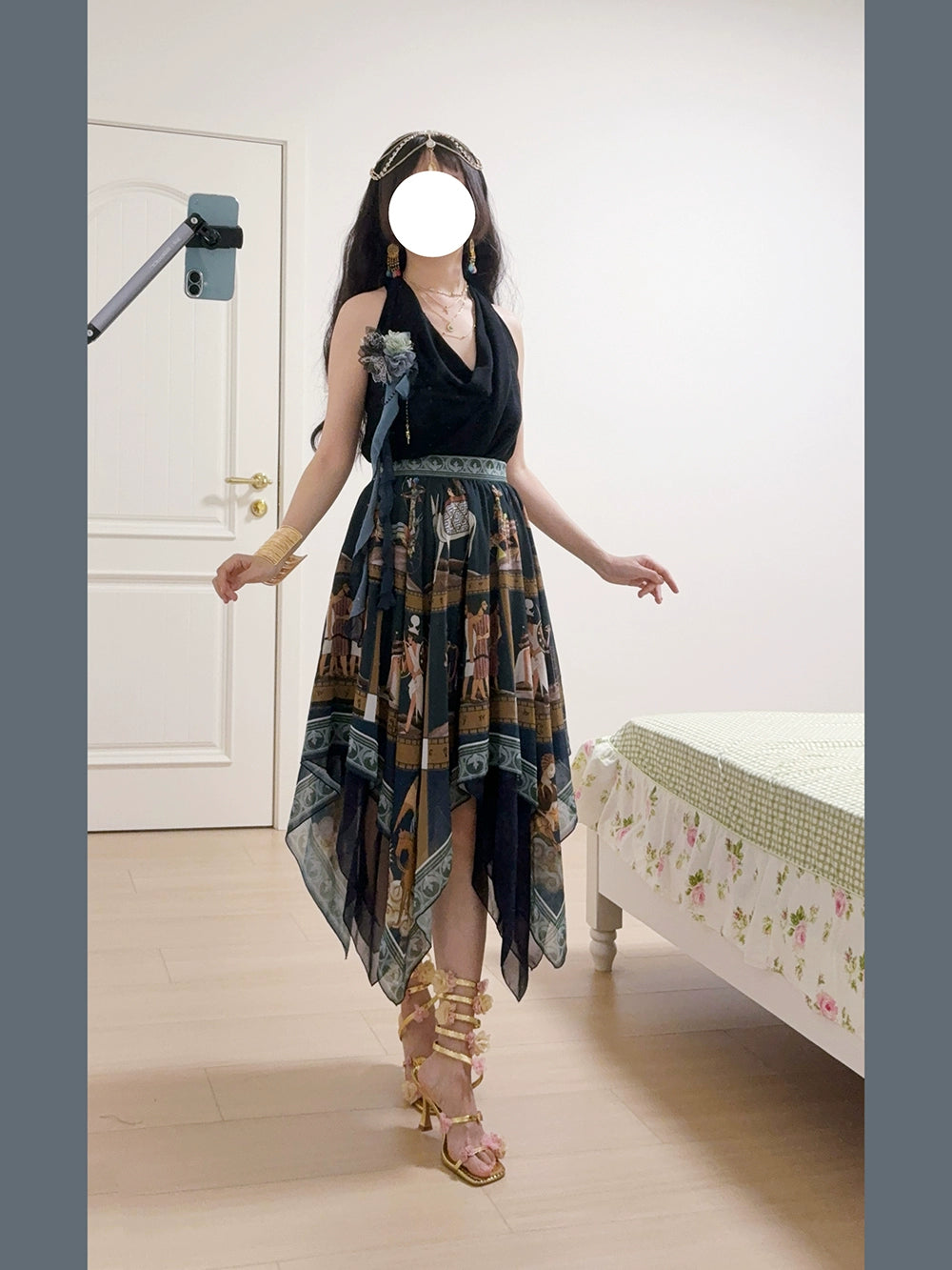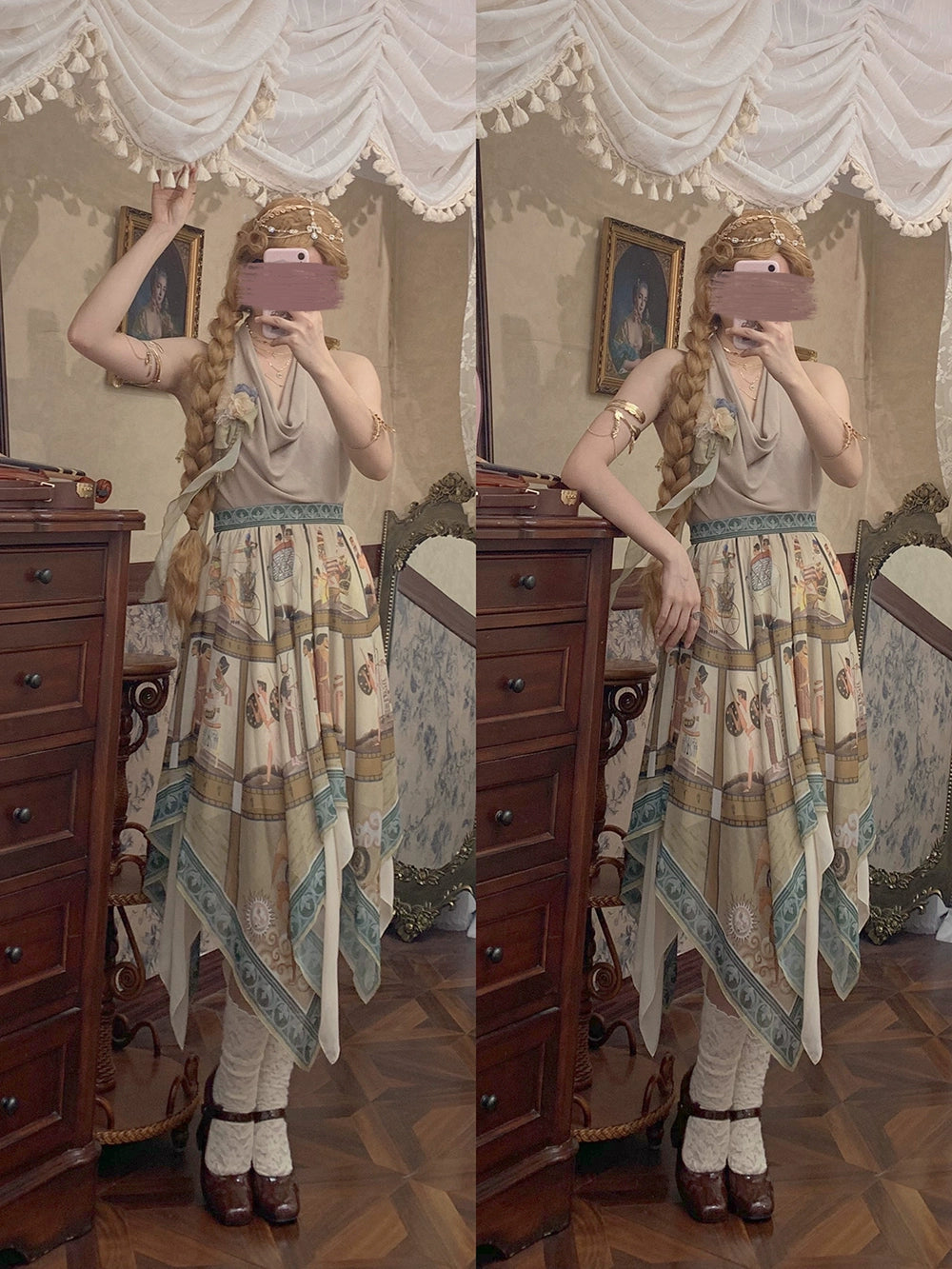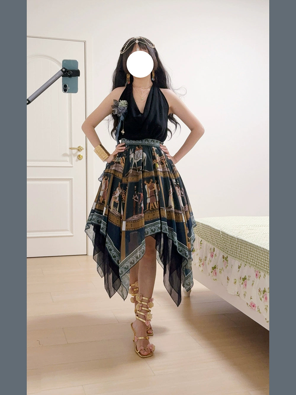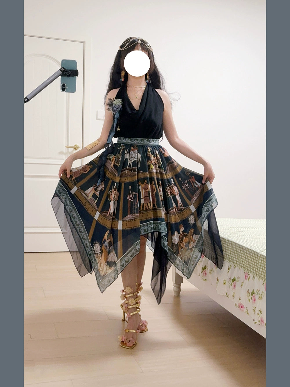 エジプト風のプリントが個性的なスカート。イレギュラーな裾のデザインで軽やかな雰囲気に。