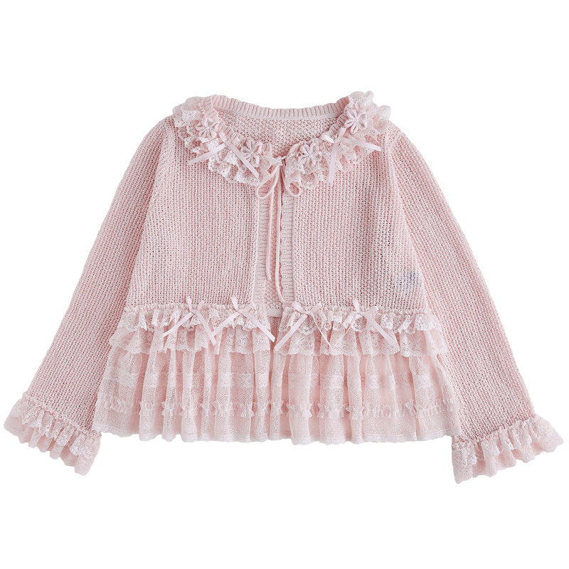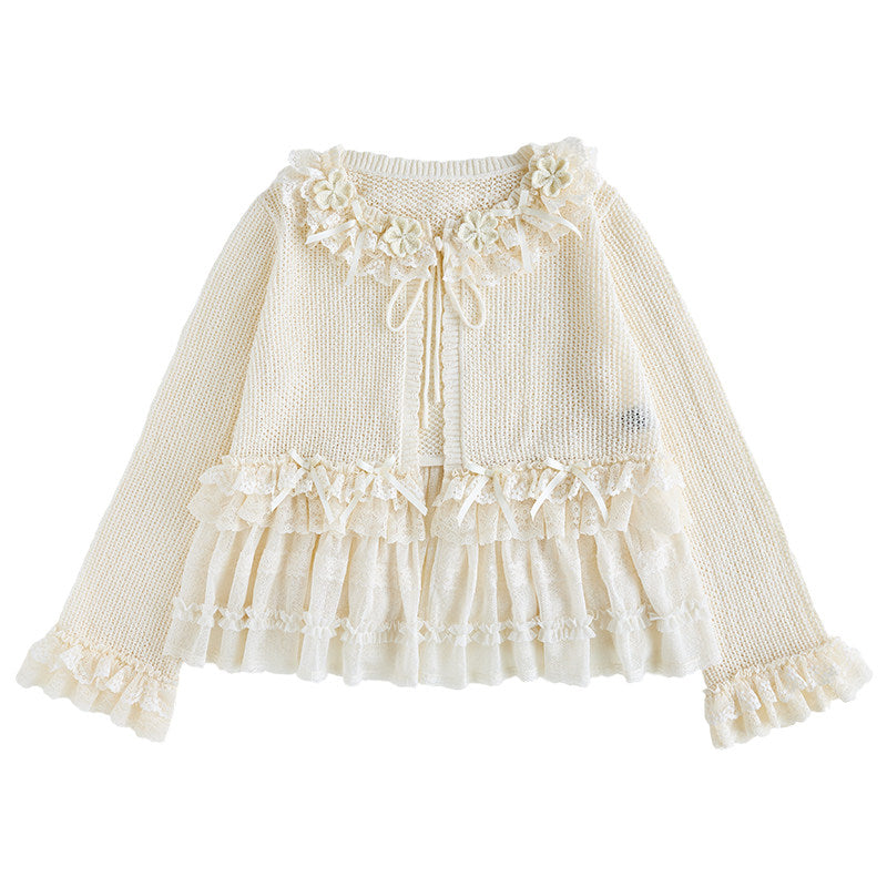 レースやお花のモチーフがあしらわれた、やさしい透け感が魅力のカーディガン。