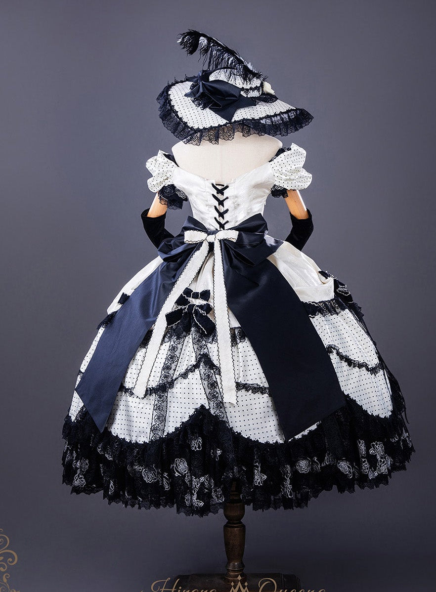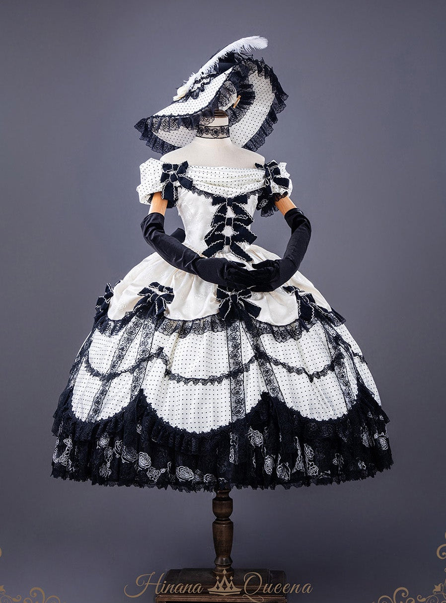 モノトーンの水玉模様がエレガントなドレス。リボンタイプはたっぷりリボンとブラックのレースで華やかに。