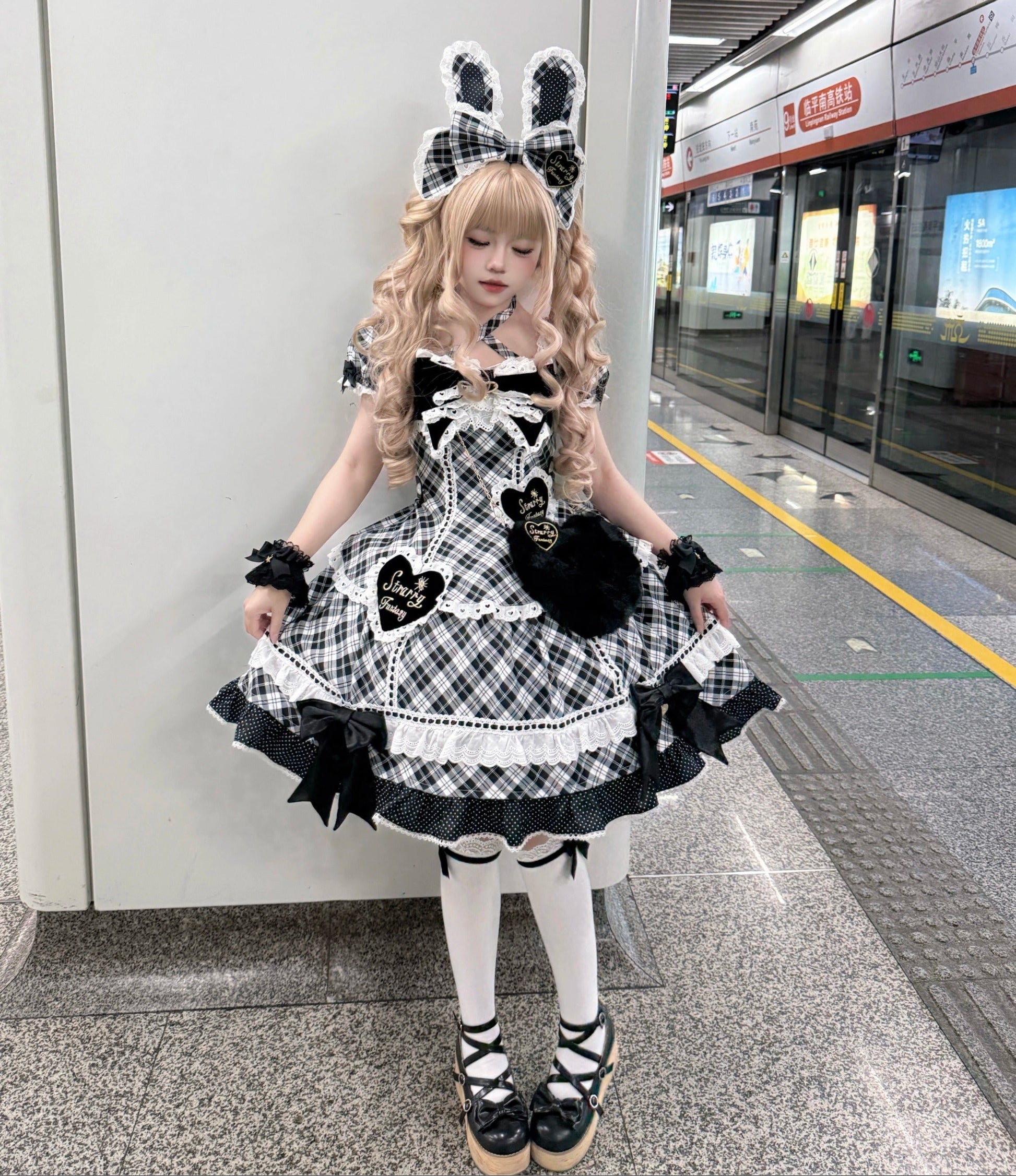 カチューシャは大きなリボンにうさ耳付き、ヘッドドレスは猫耳付き。