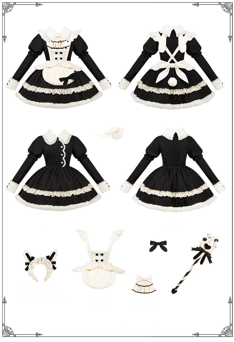 裾やうさ耳にファーがあしらわれたキュートなエプロン付きワンピース。