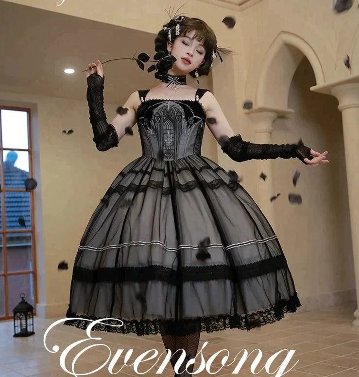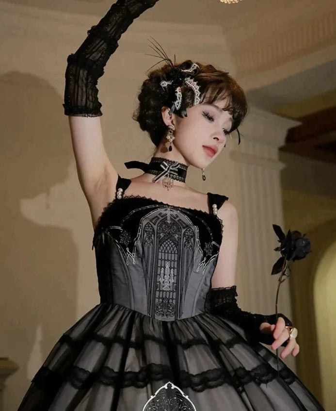 ブラックに神秘的な燭台と教会が刺繍されたがゴシックなジャンパースカート。