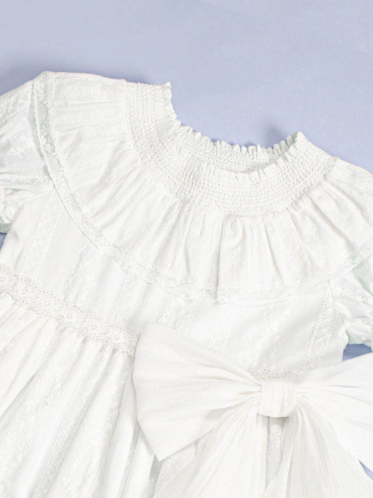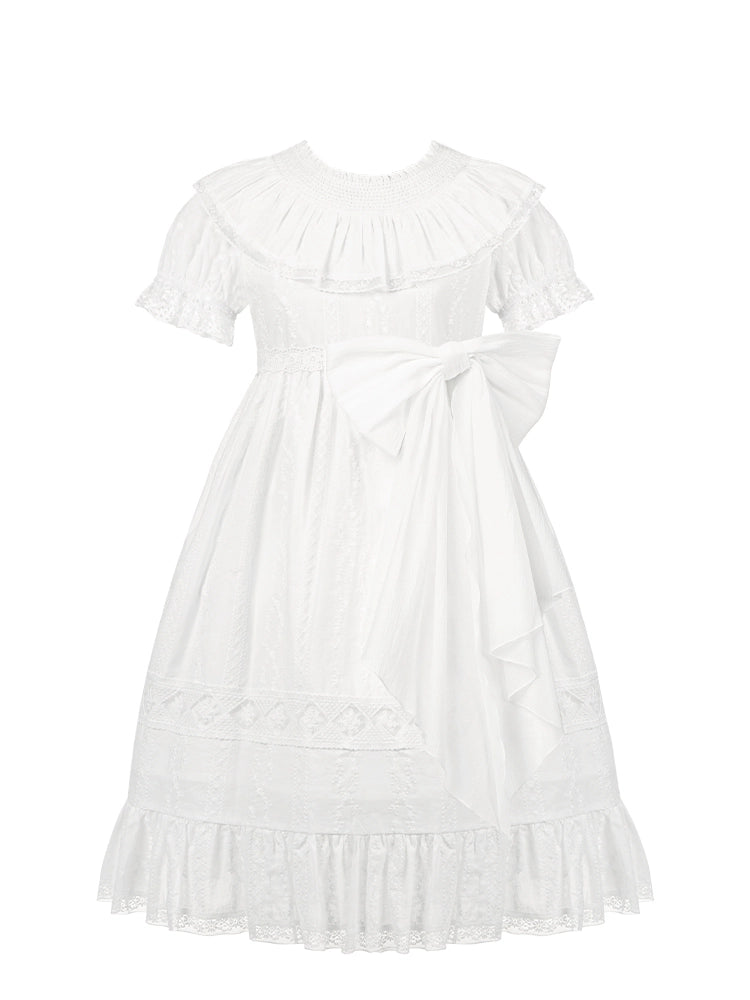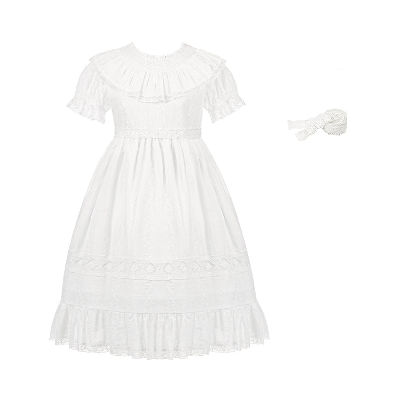 刺繍入りのコットン生地が上品な半袖ワンピース(レースのウエストベルト付き)。