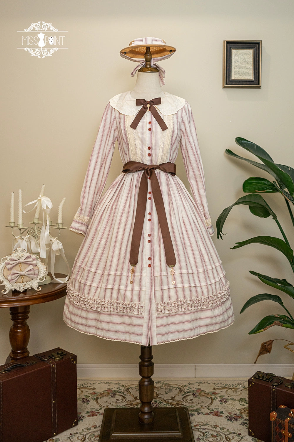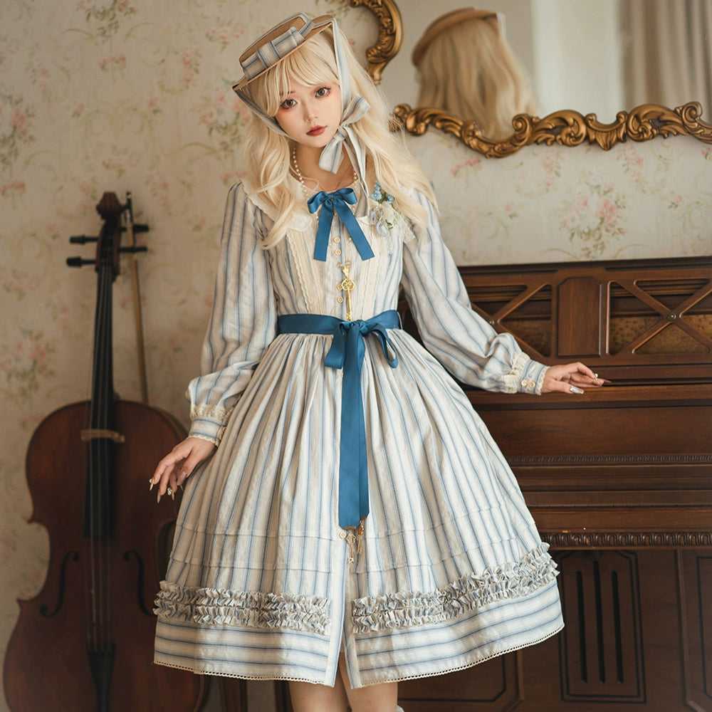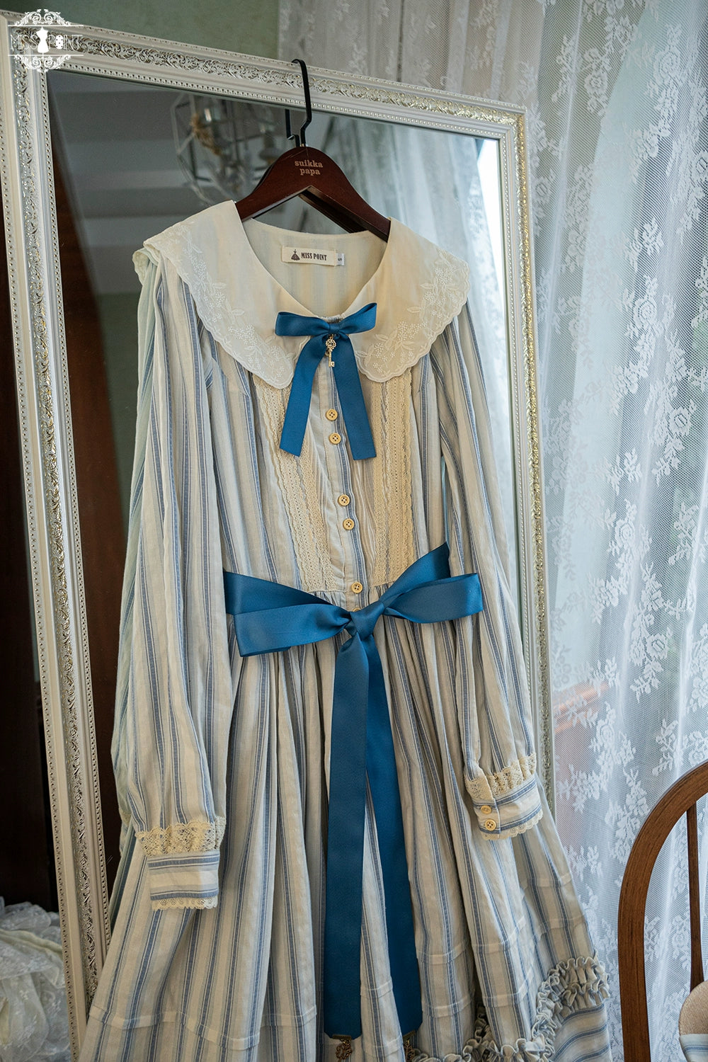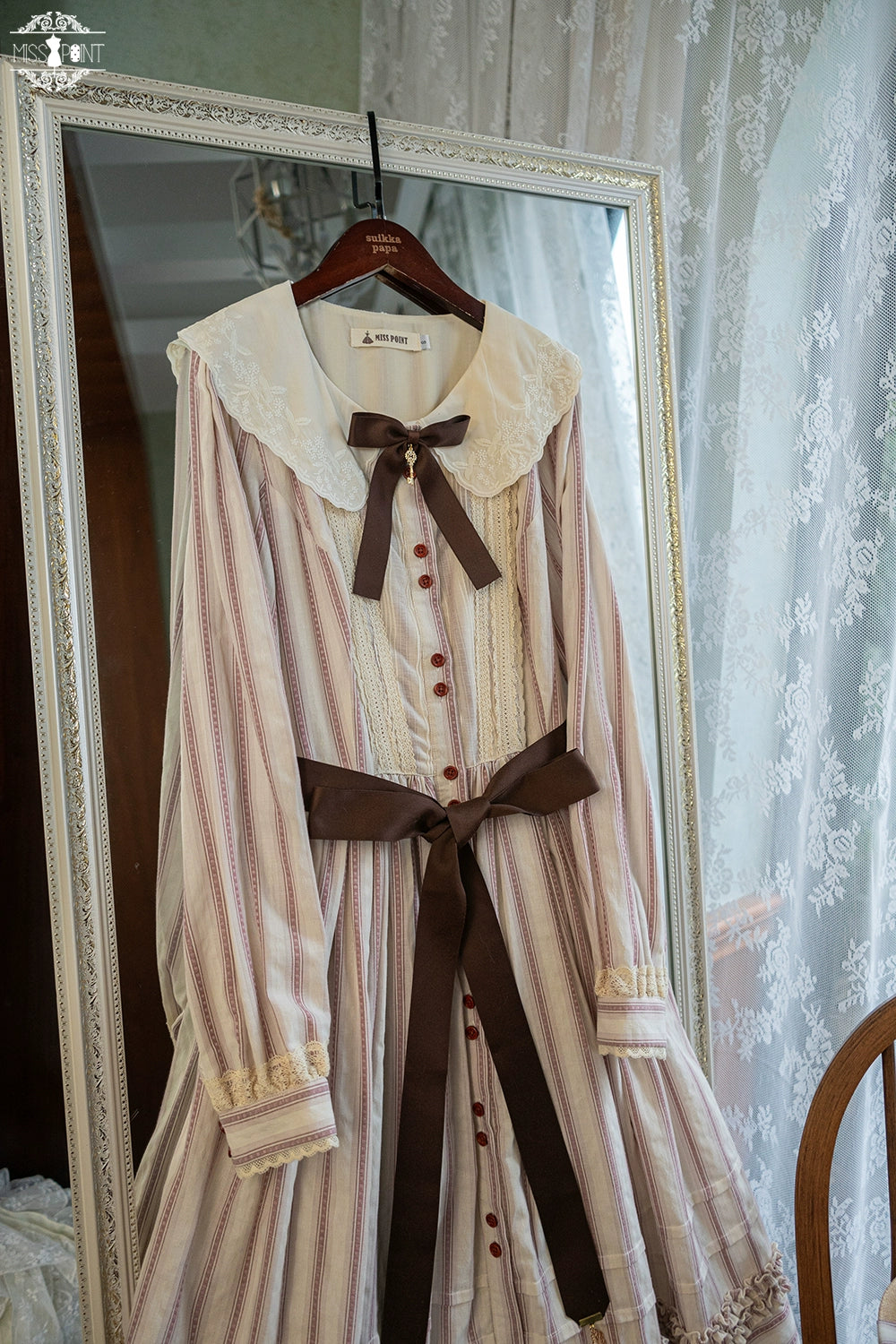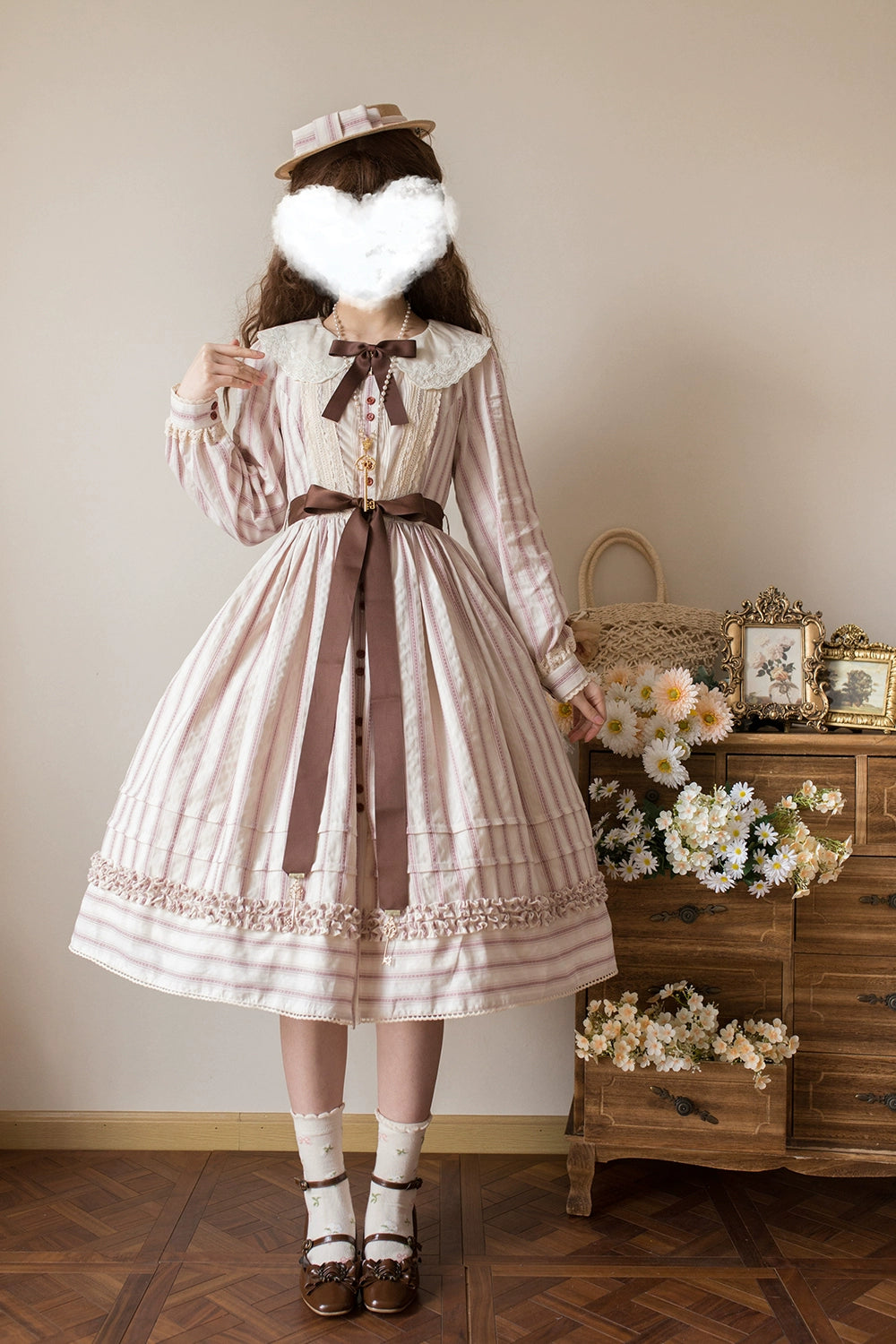 ナチュラルカラーのストライプが優しい雰囲気の長袖ワンピース。布ベルト、リボンタイ、パールピン付き。