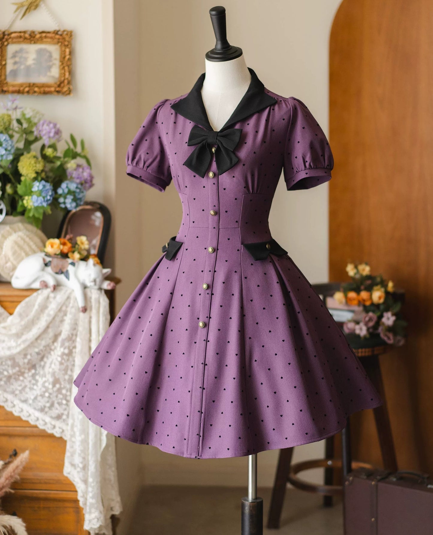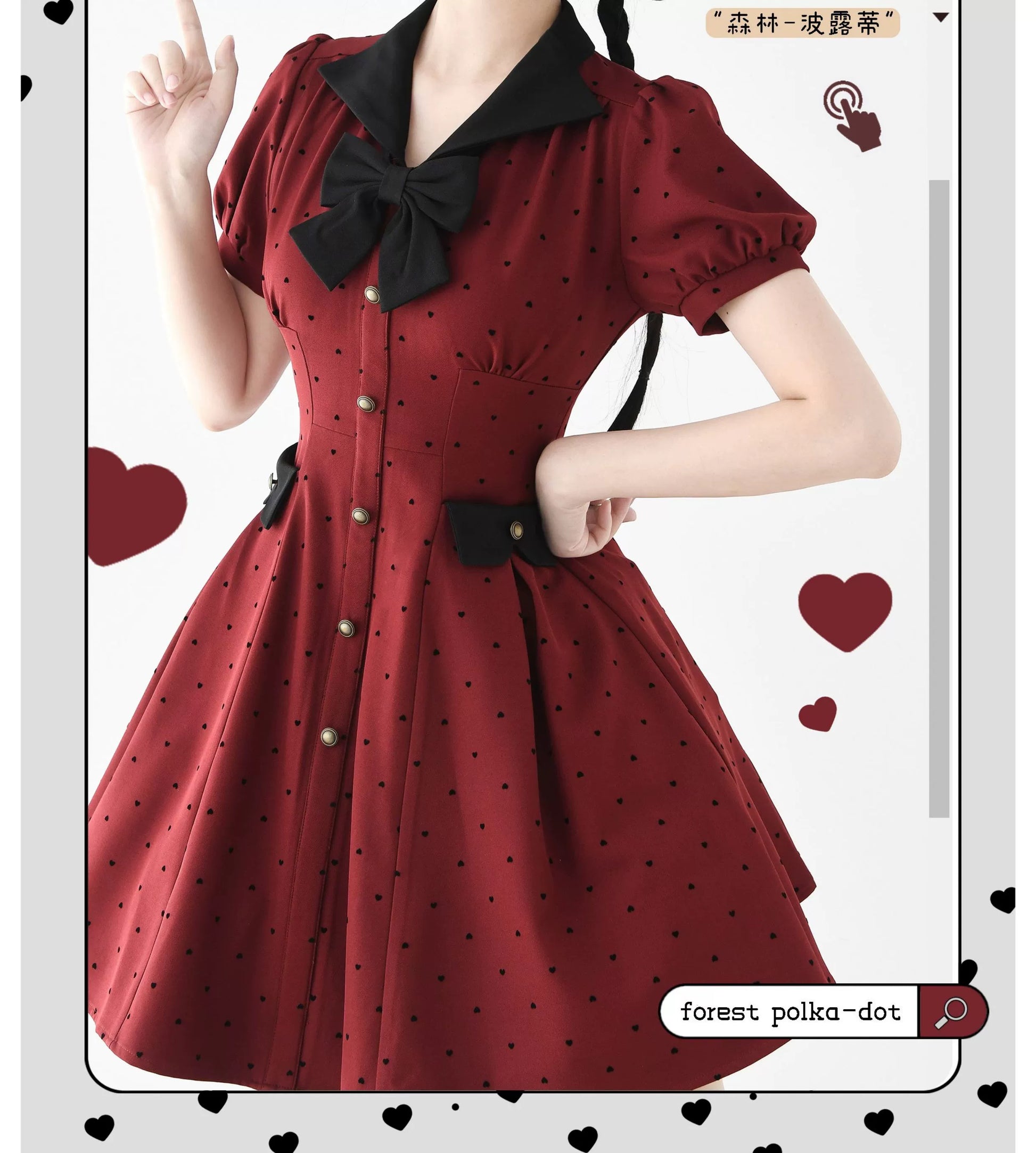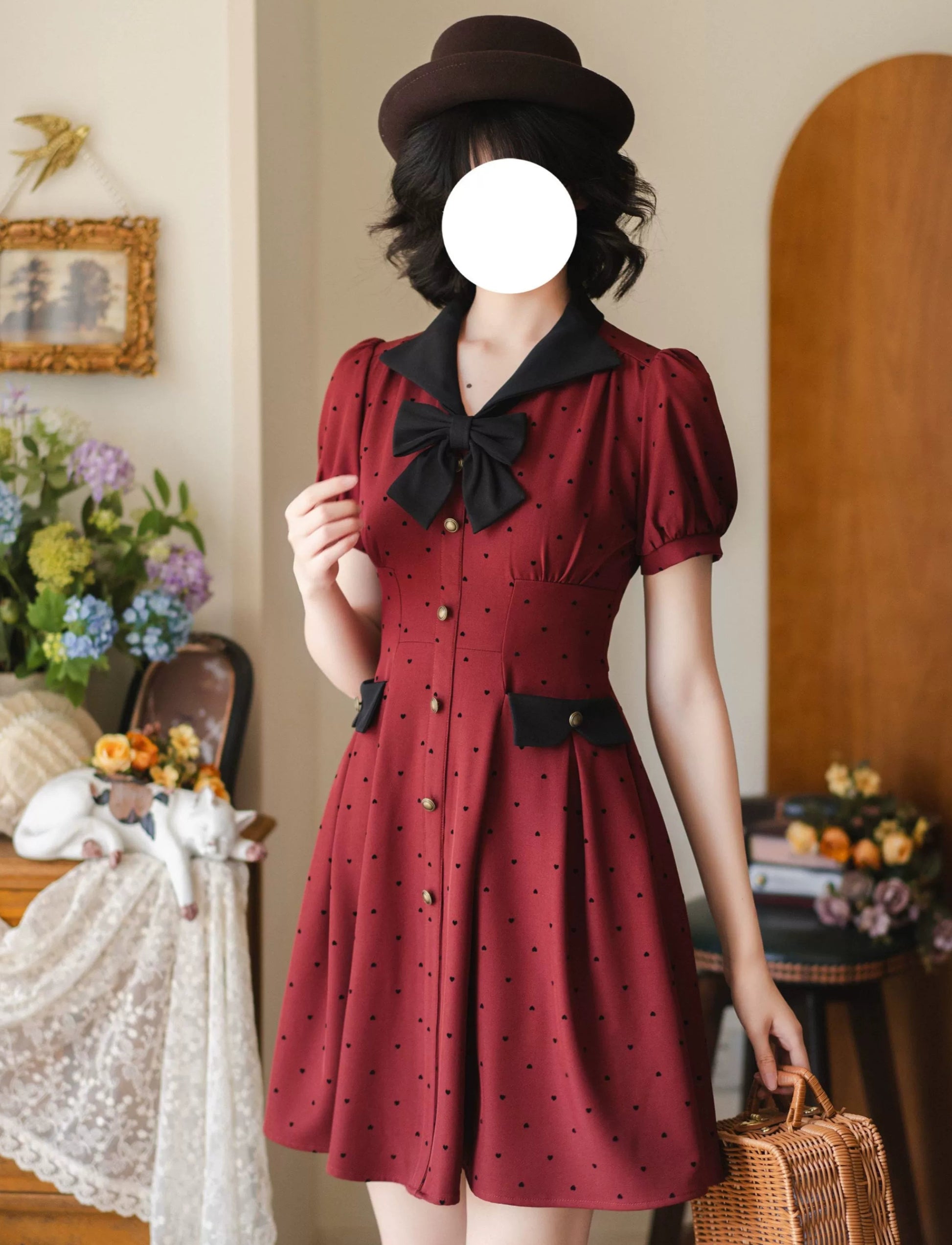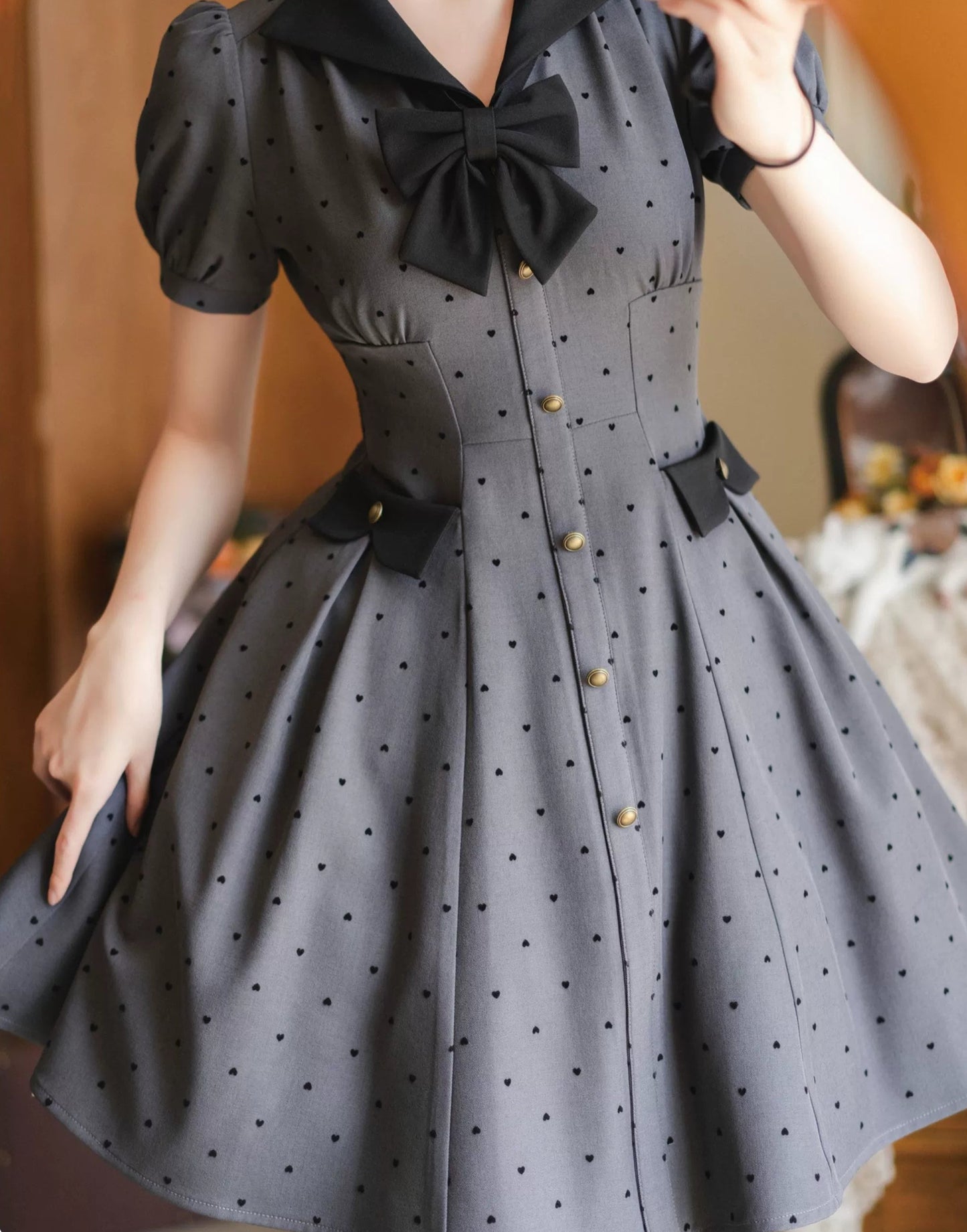 短めの着丈に小さなハートの水玉柄が可愛い半袖ワンピース。