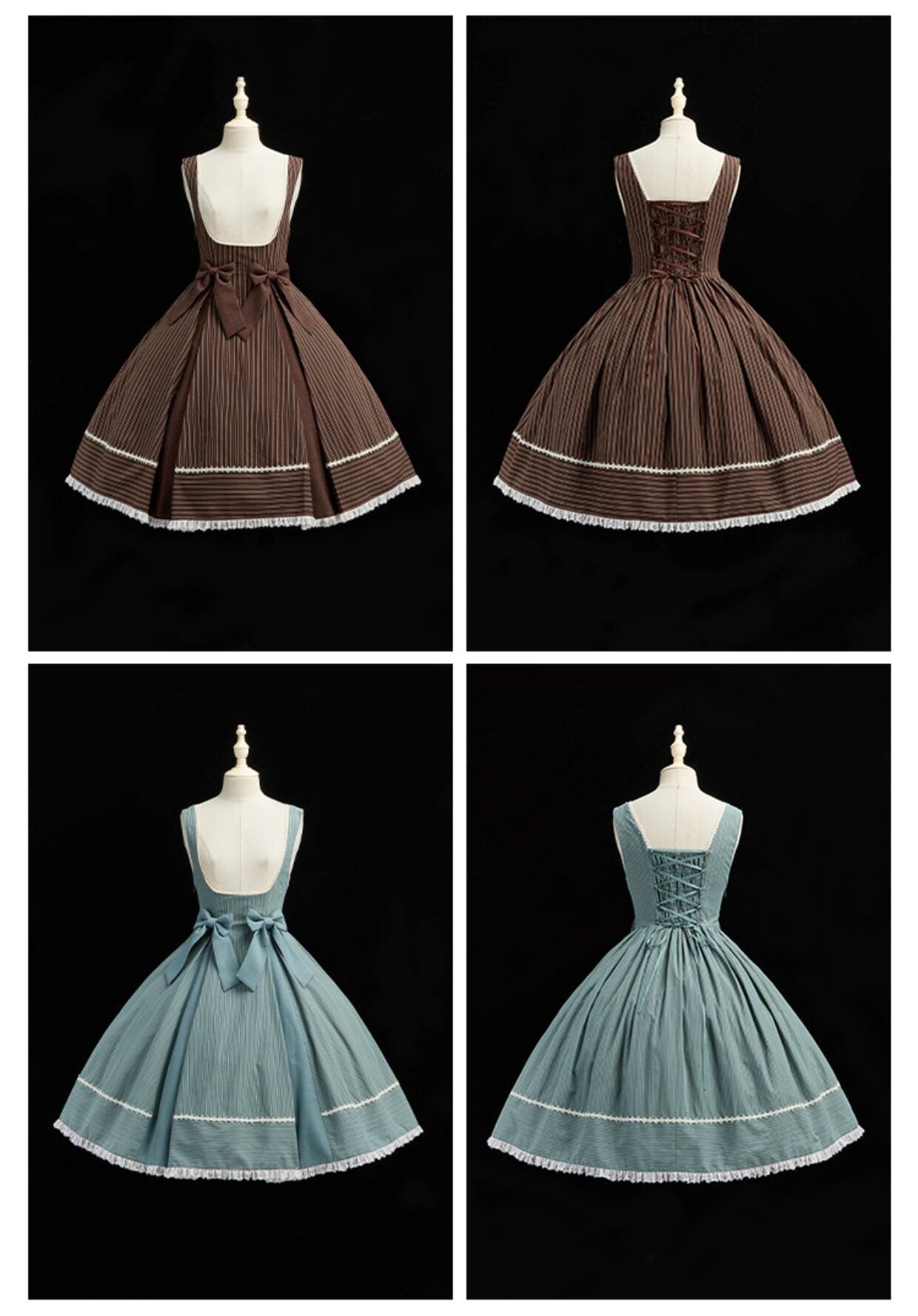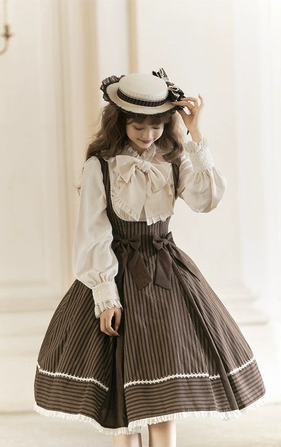 シックなカラーにストライプが上品なジャンパースカート。コルセット風デザインでよりクラシカルな印象に♡