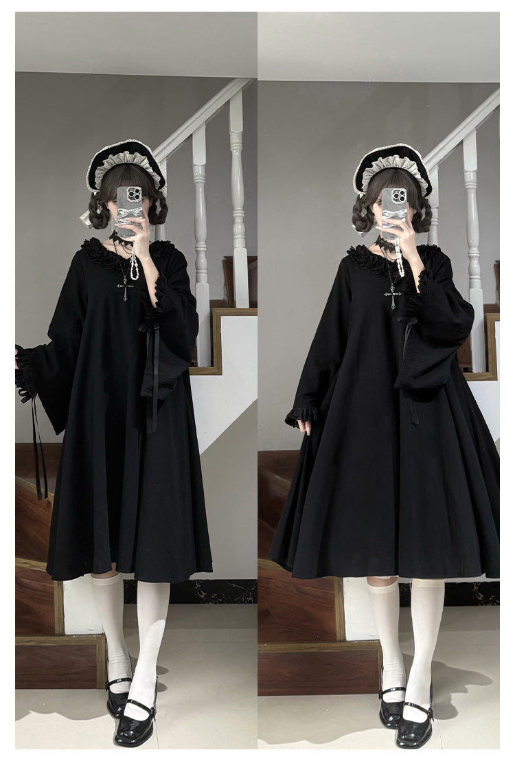着物風のお袖が特徴の長袖ワンピース。