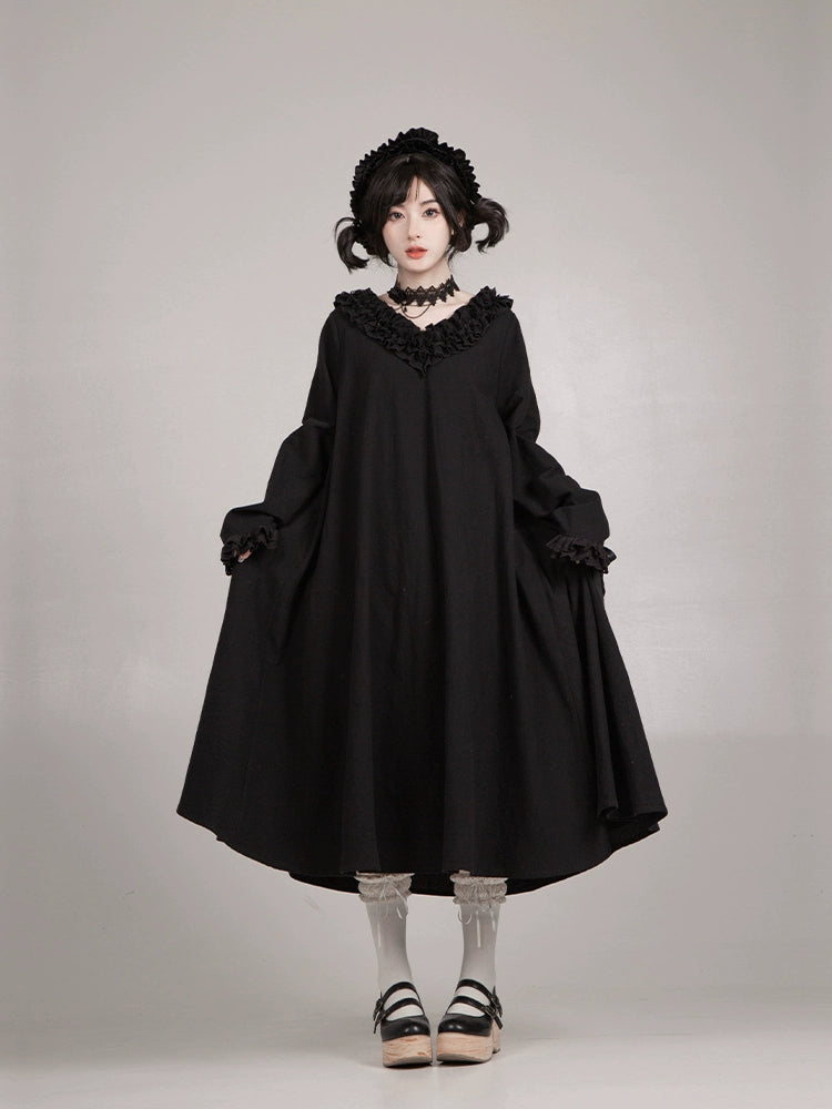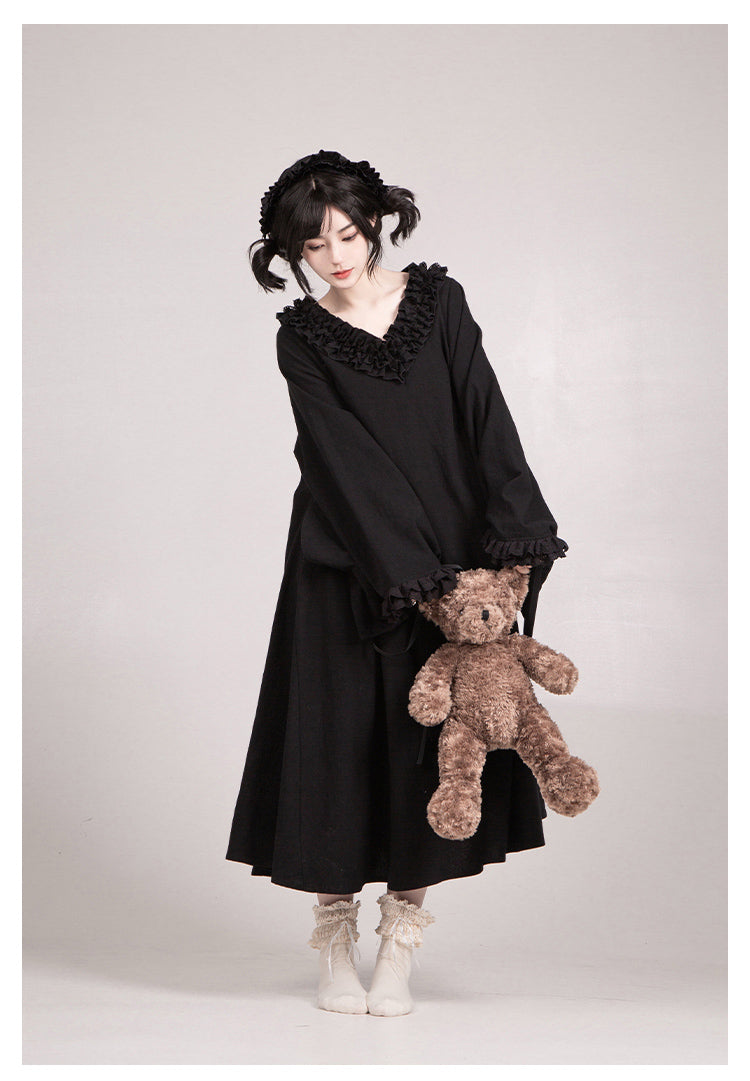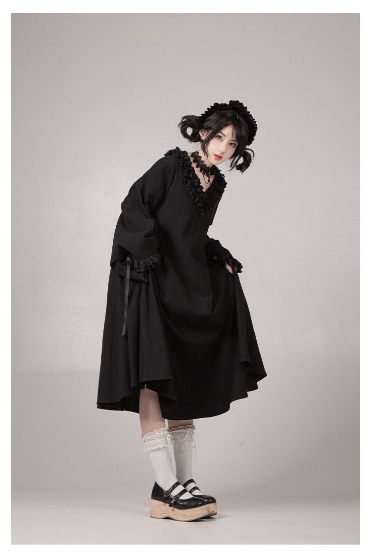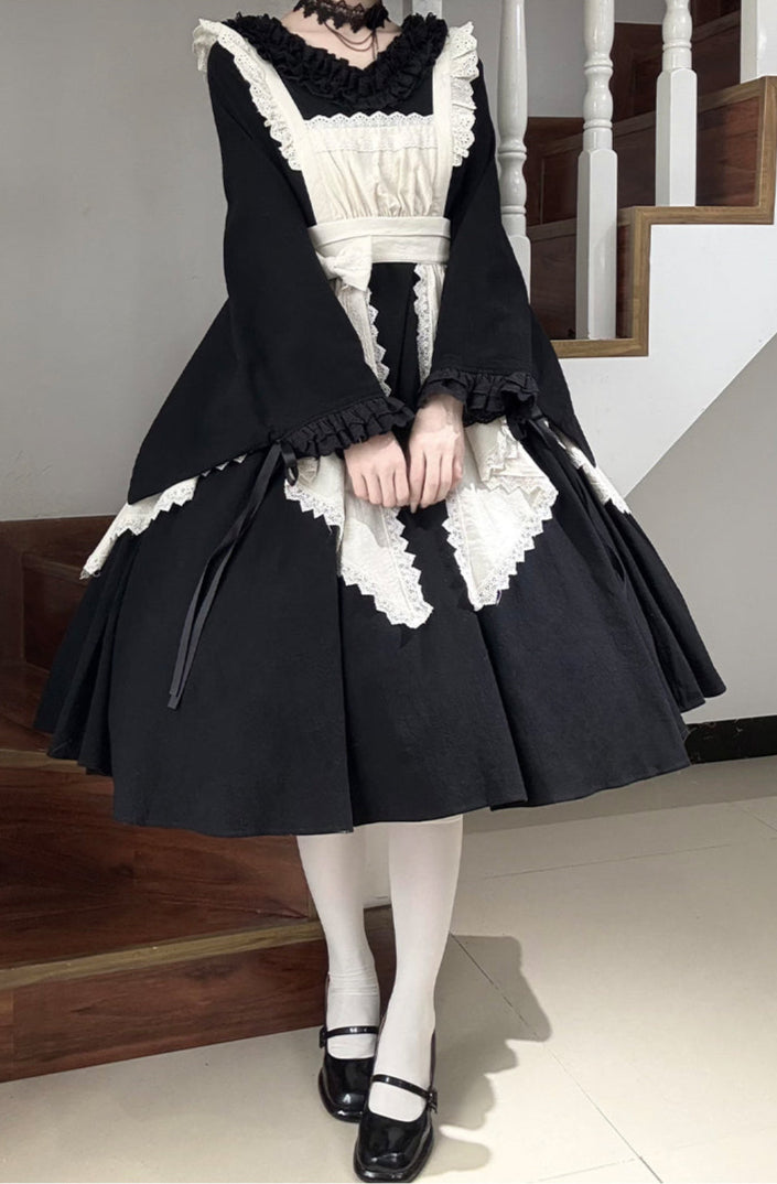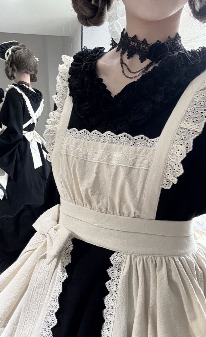 生成色のエプロンを合わせて和風メイドに。ゴシックなアイテムを合わせたゴスロリ風の着こなしもオススメです。