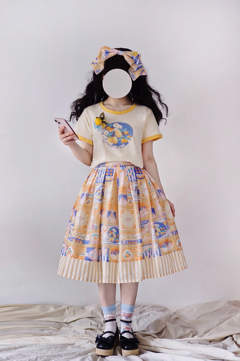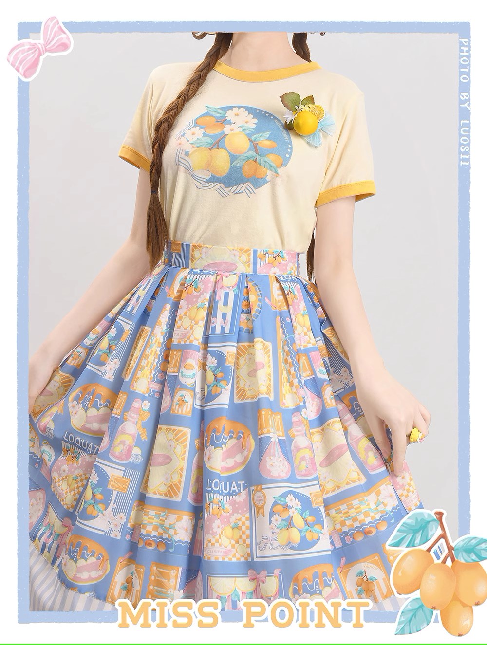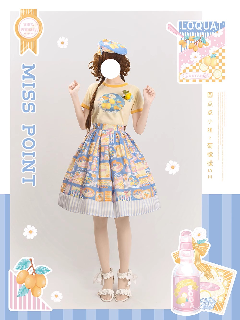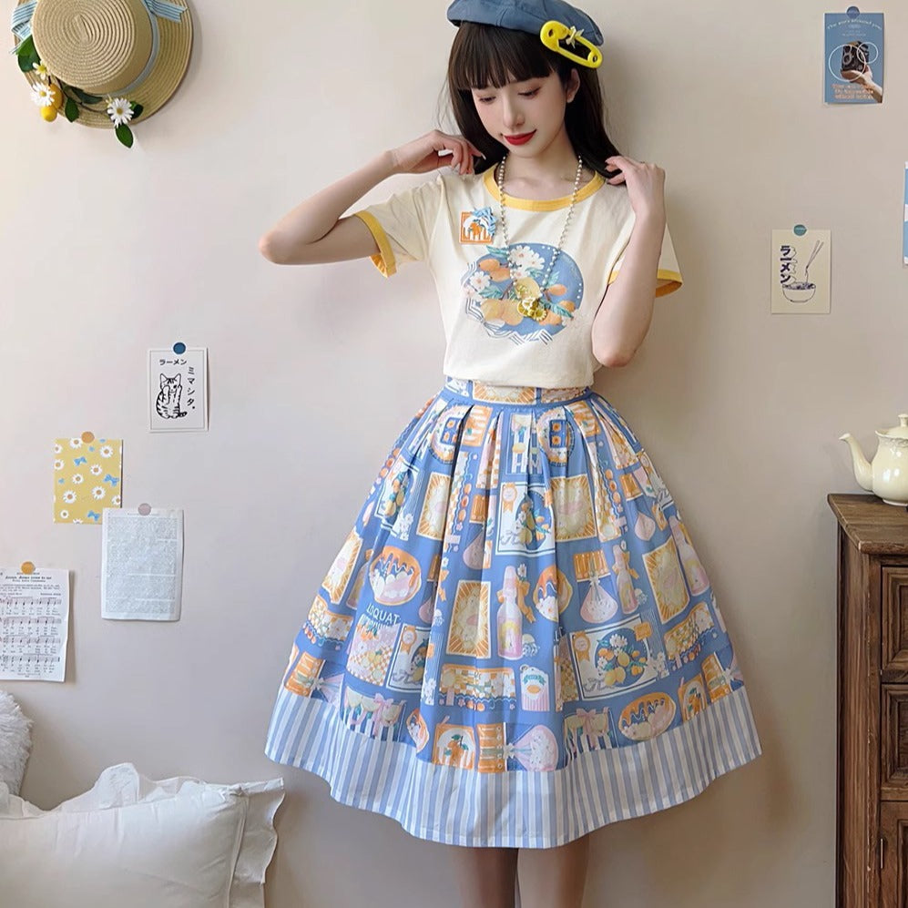 枇杷やレモン、サイダーがプリントされた爽やかなスカート。