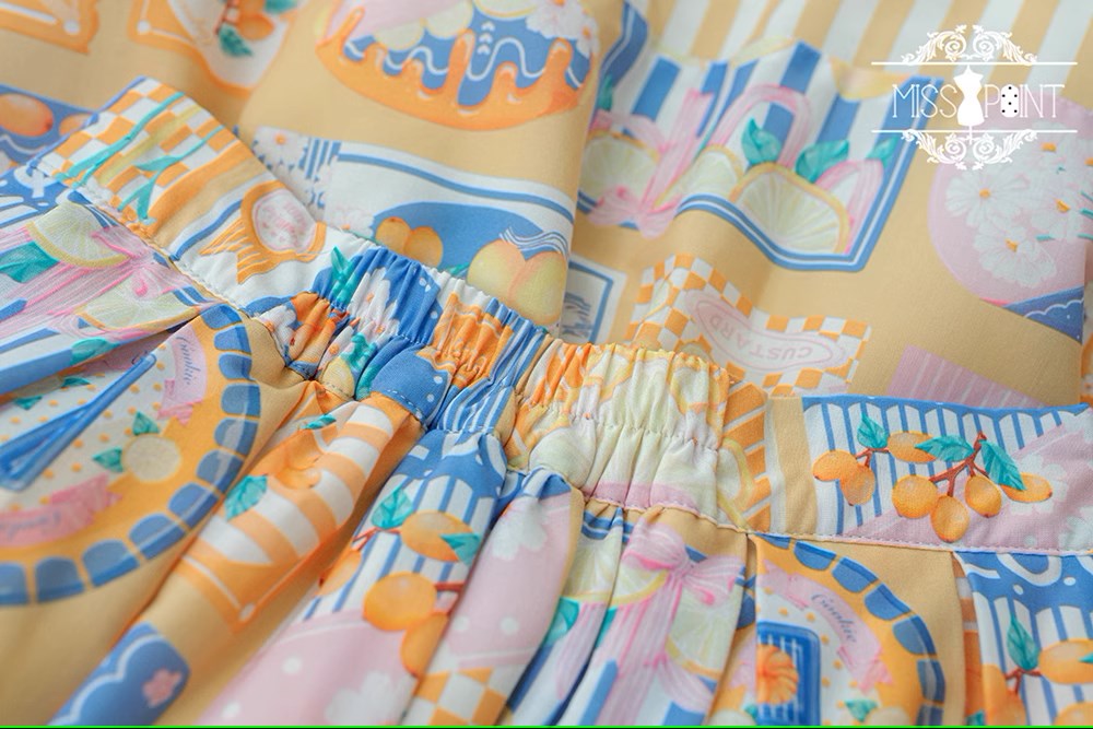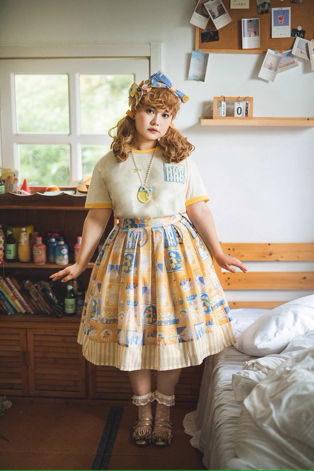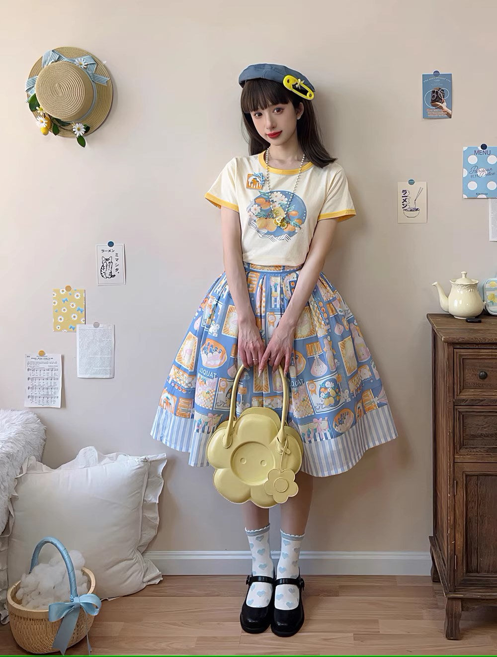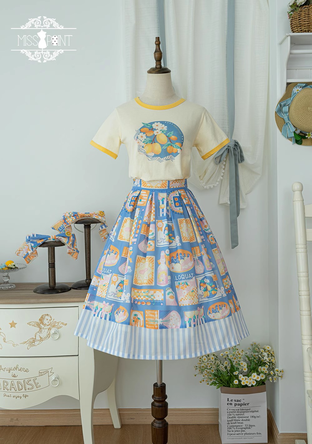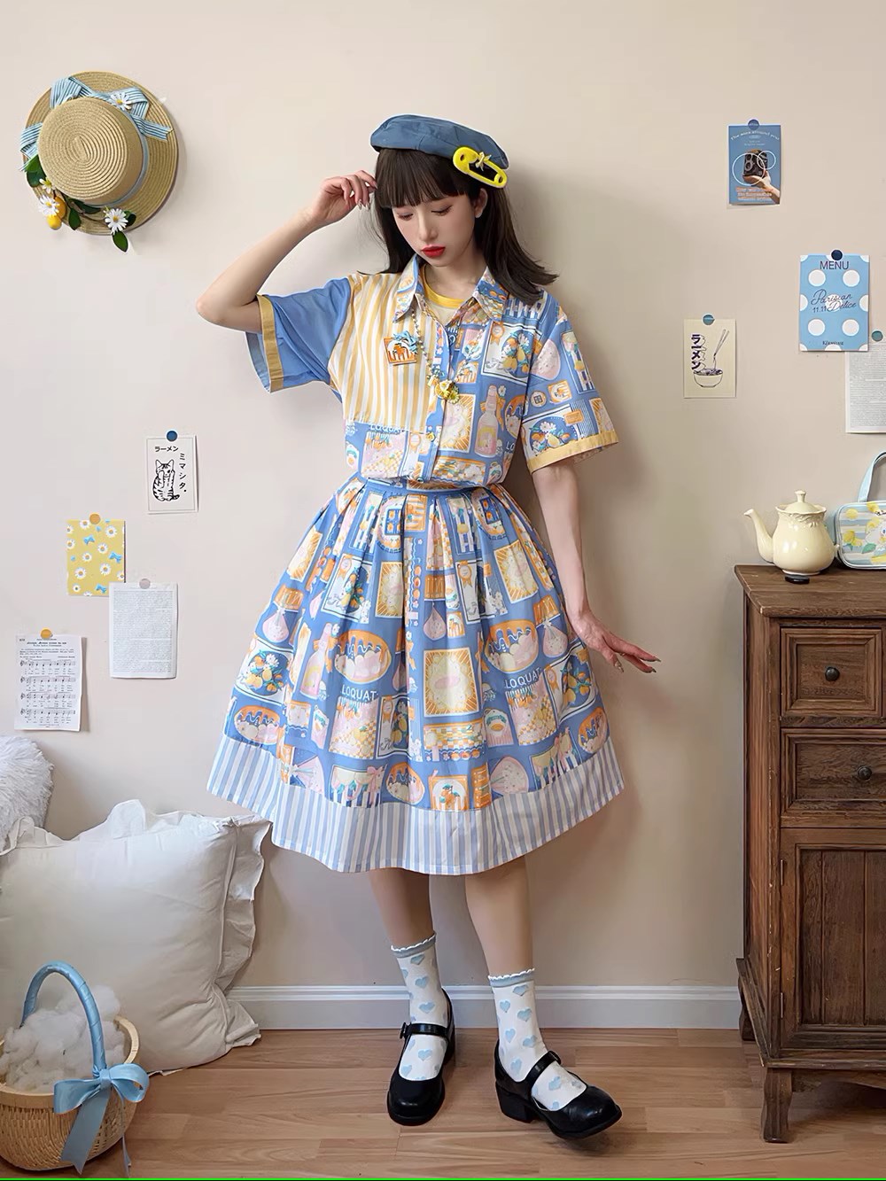 枇杷やレモン、サイダーがプリントされた爽やかなスカート。