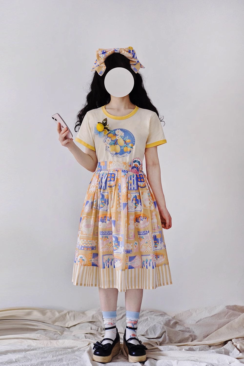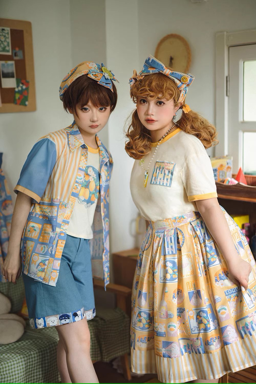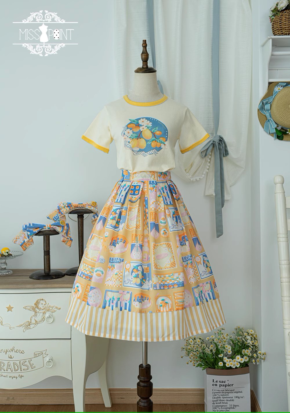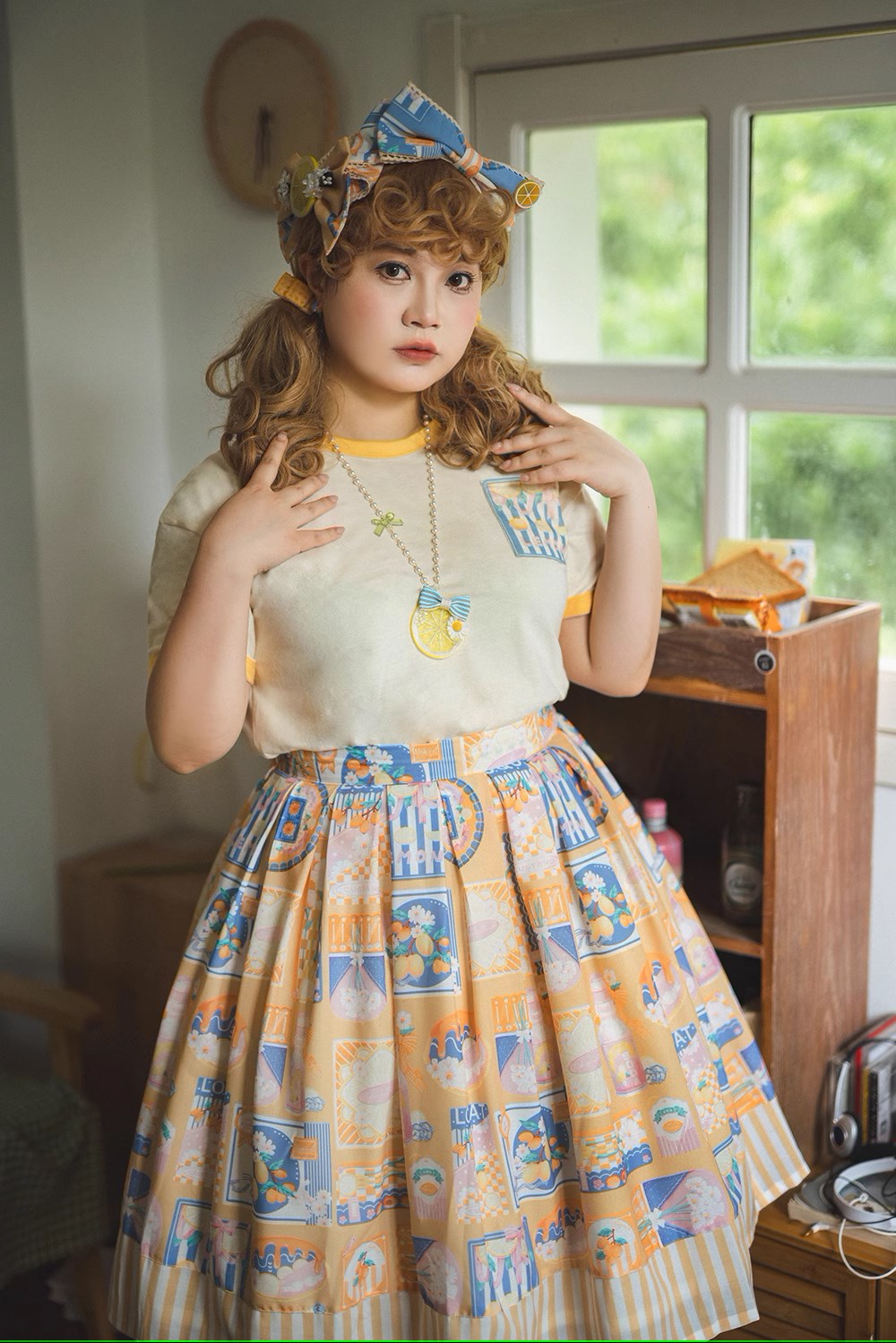 枇杷やレモン、サイダーがプリントされた爽やかなスカート。