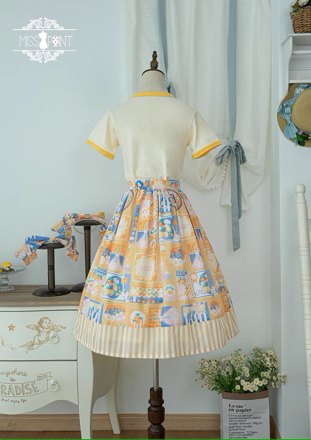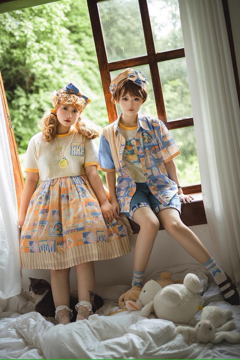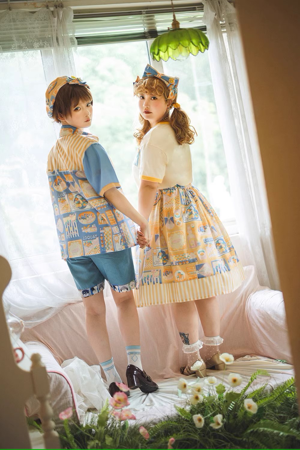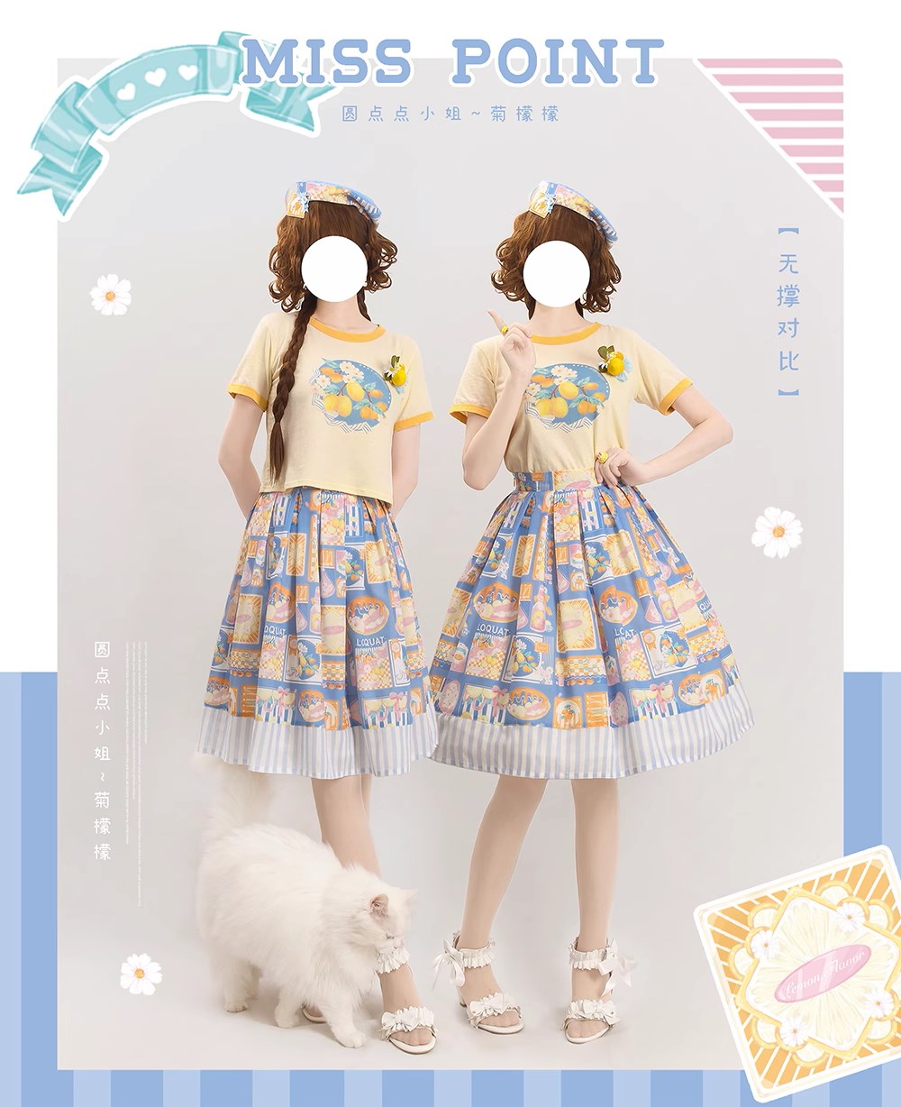 枇杷やレモン、サイダーがプリントされた爽やかなスカート。