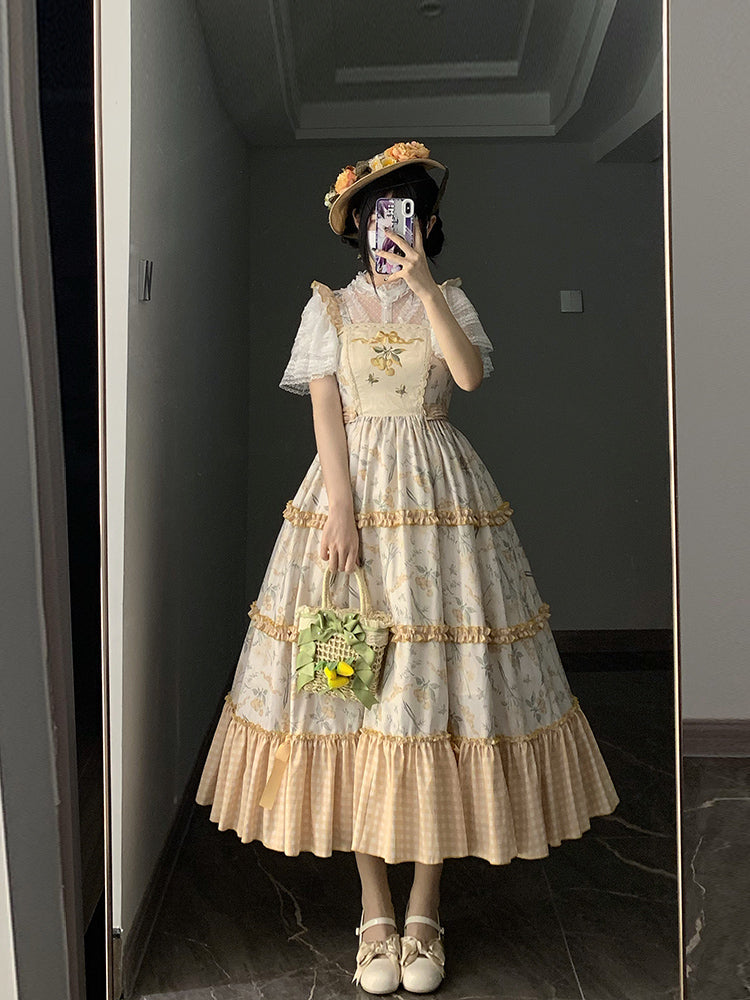 真夏のイエローギンガムチェック チェリー柄ジャンパースカート
