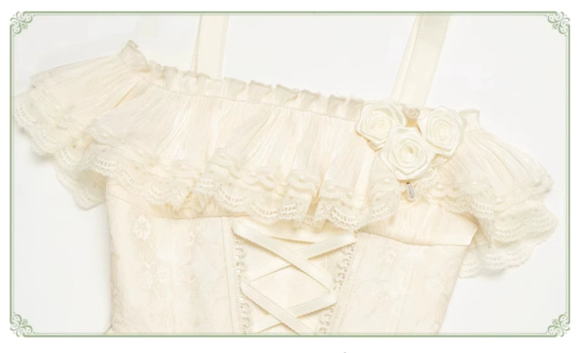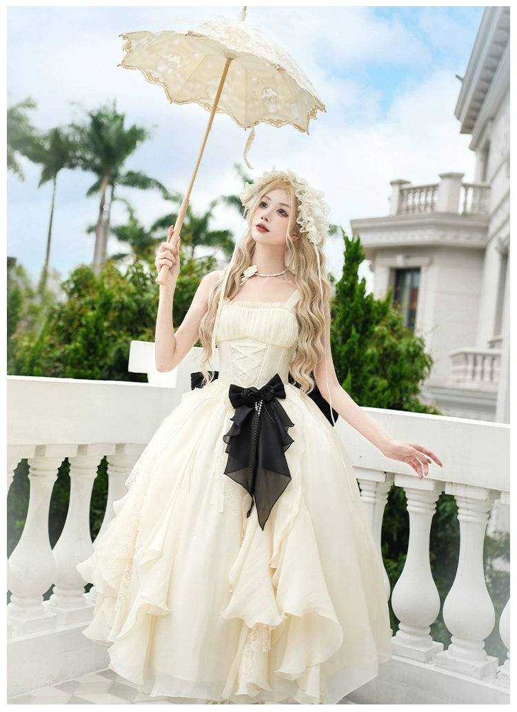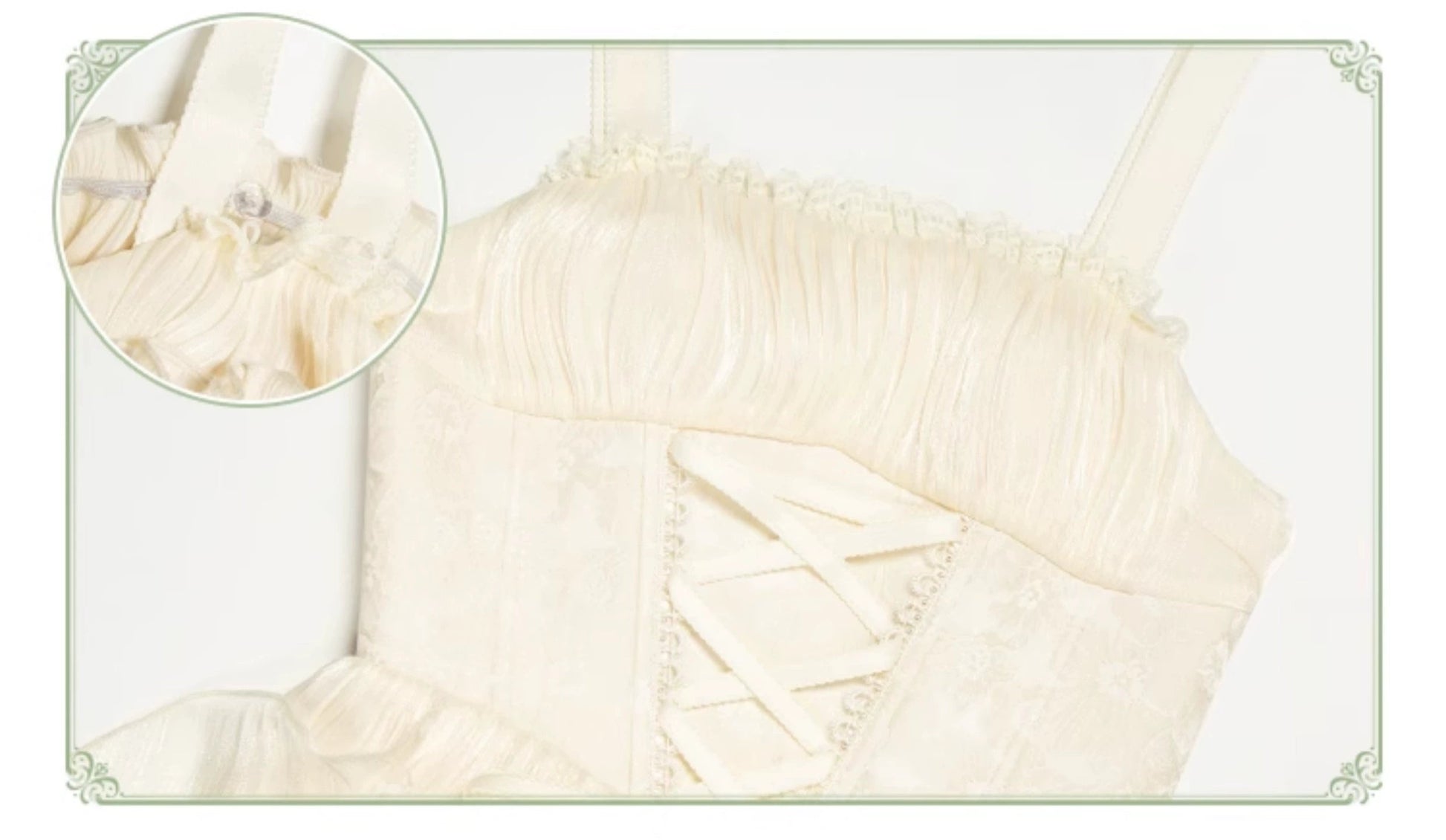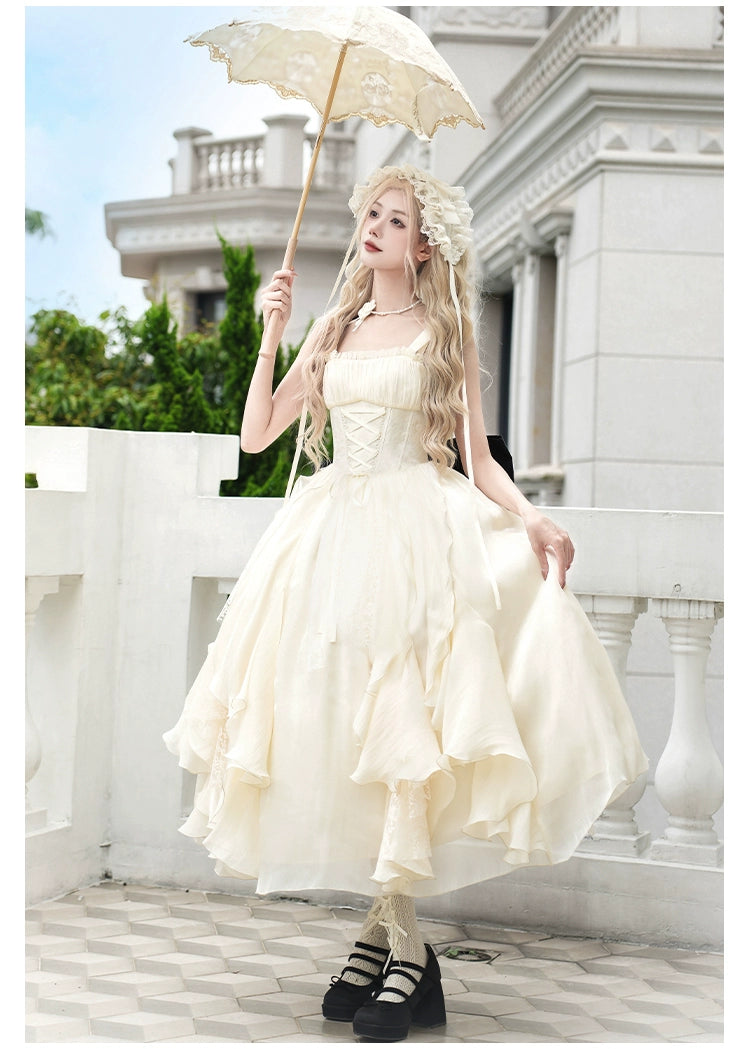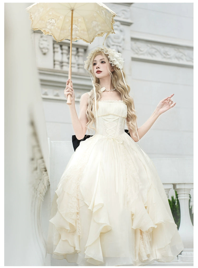 オフホワイトに胸元のレースアップとフリルがエレガントなジャンパースカート。