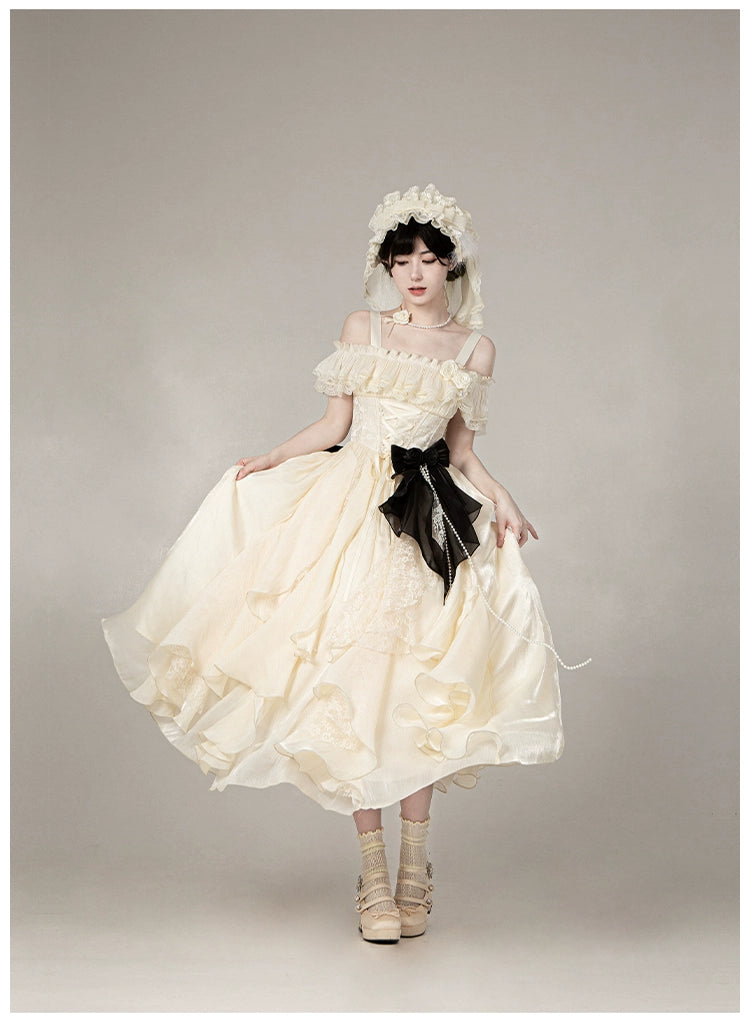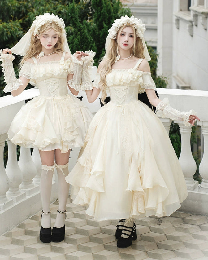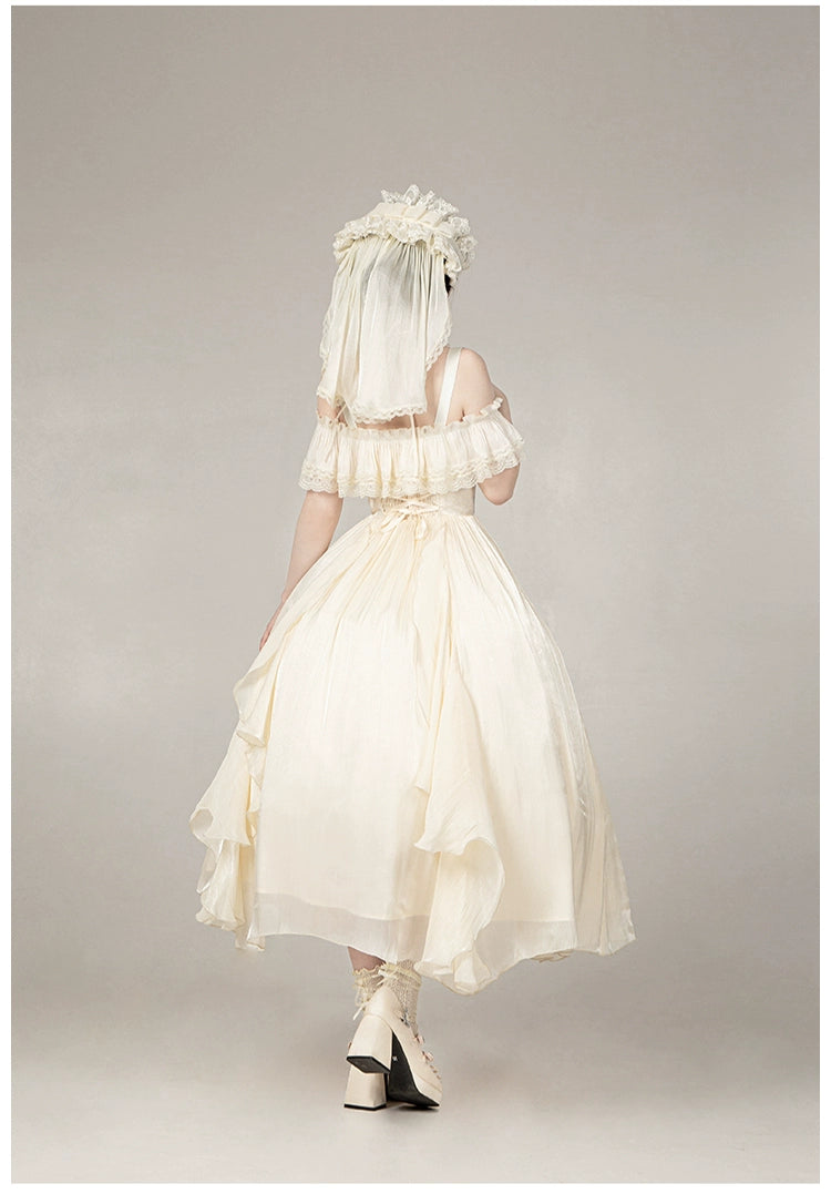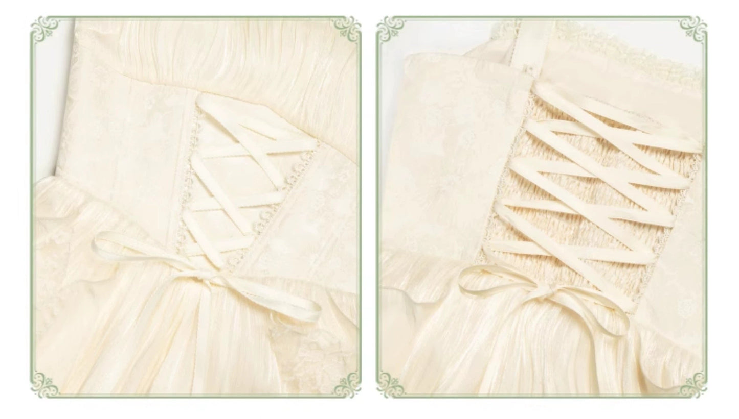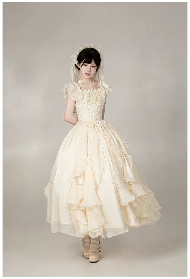 オフホワイトに胸元のレースアップとフリルがエレガントなジャンパースカート。