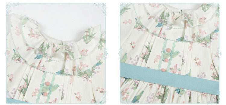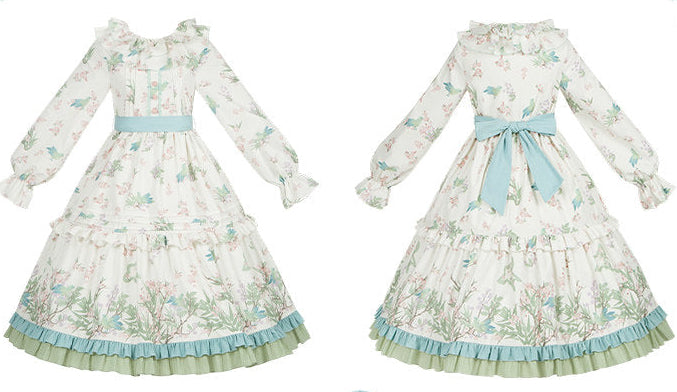 鶯がプリントされた可憐なワンピース。布ベルト付。