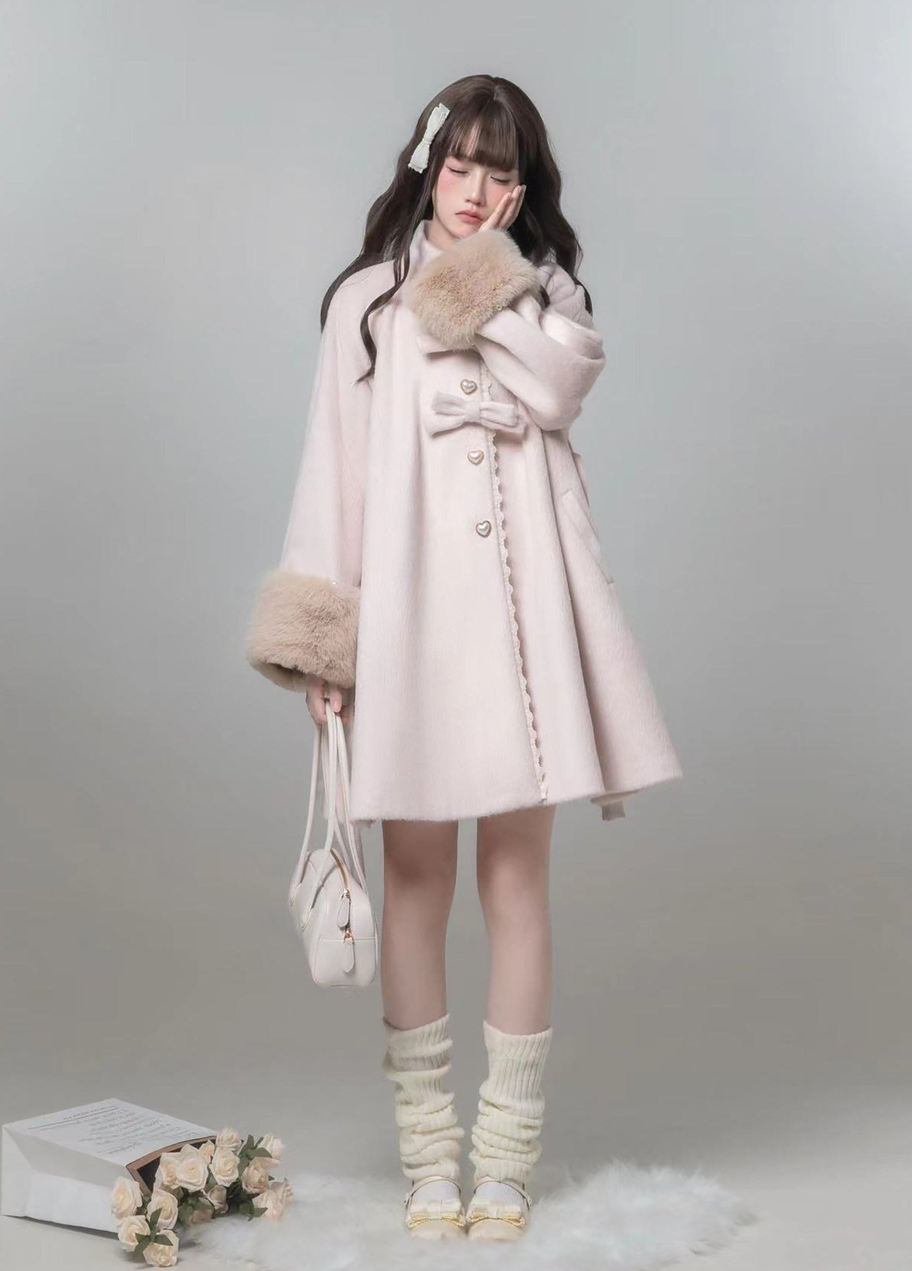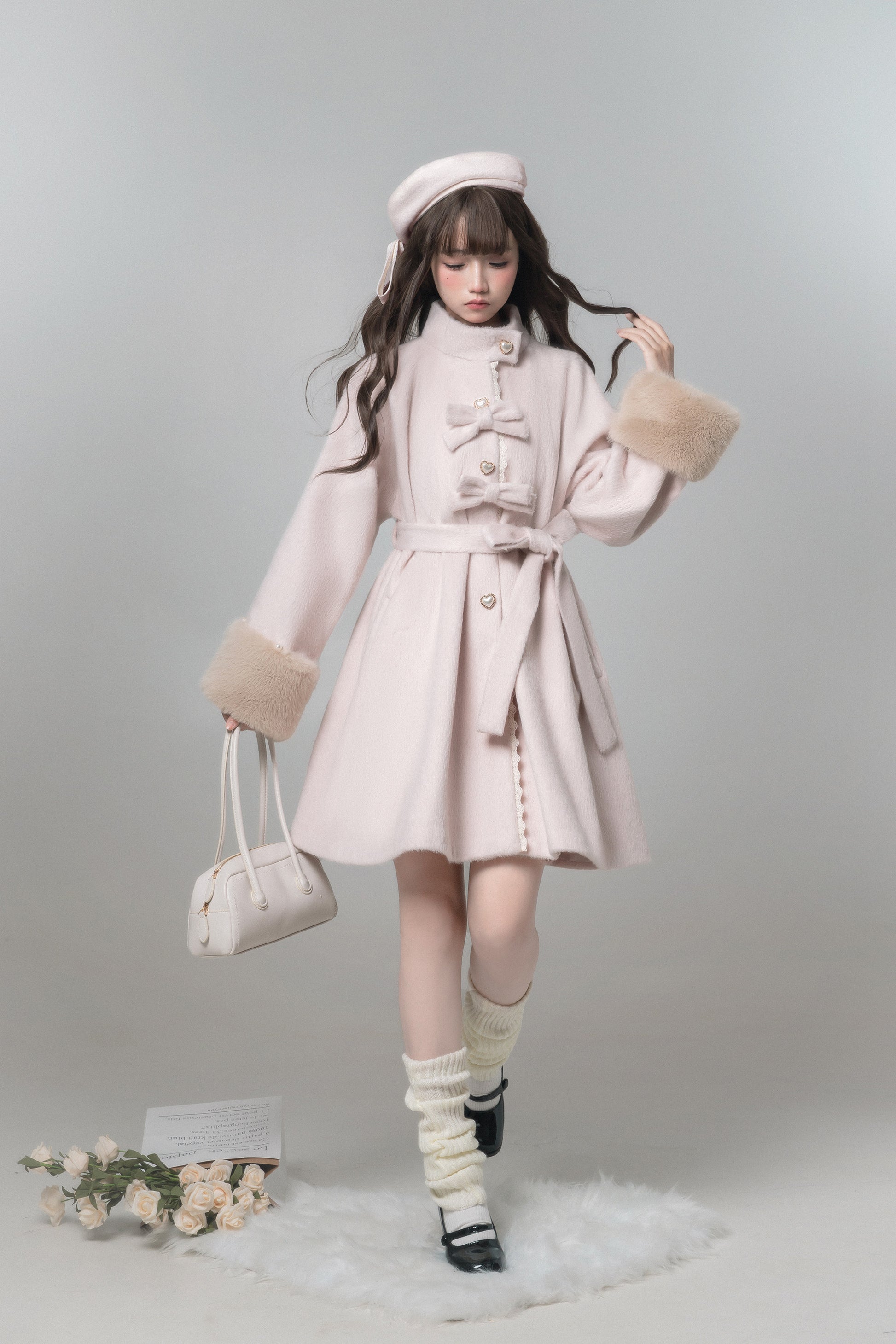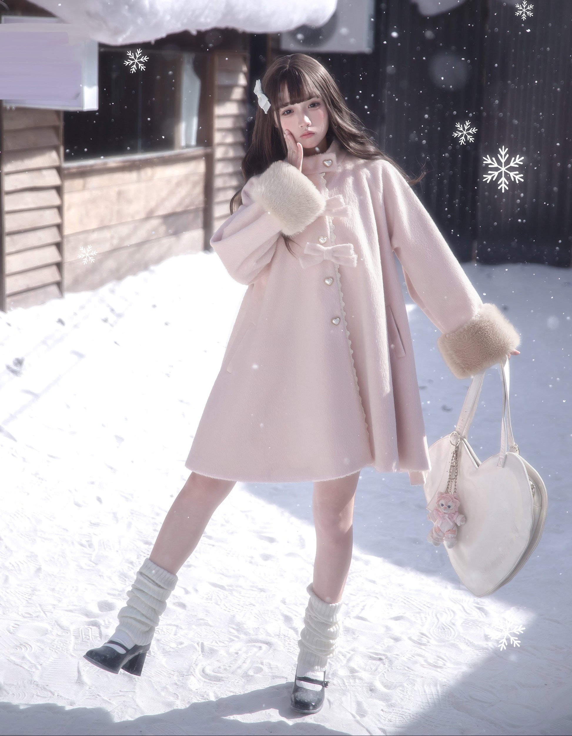 淡いピンクにリボン、ハートのボタンと可愛いが詰まったコート。袖口にファーがあしらわれて防寒もばっちり💕