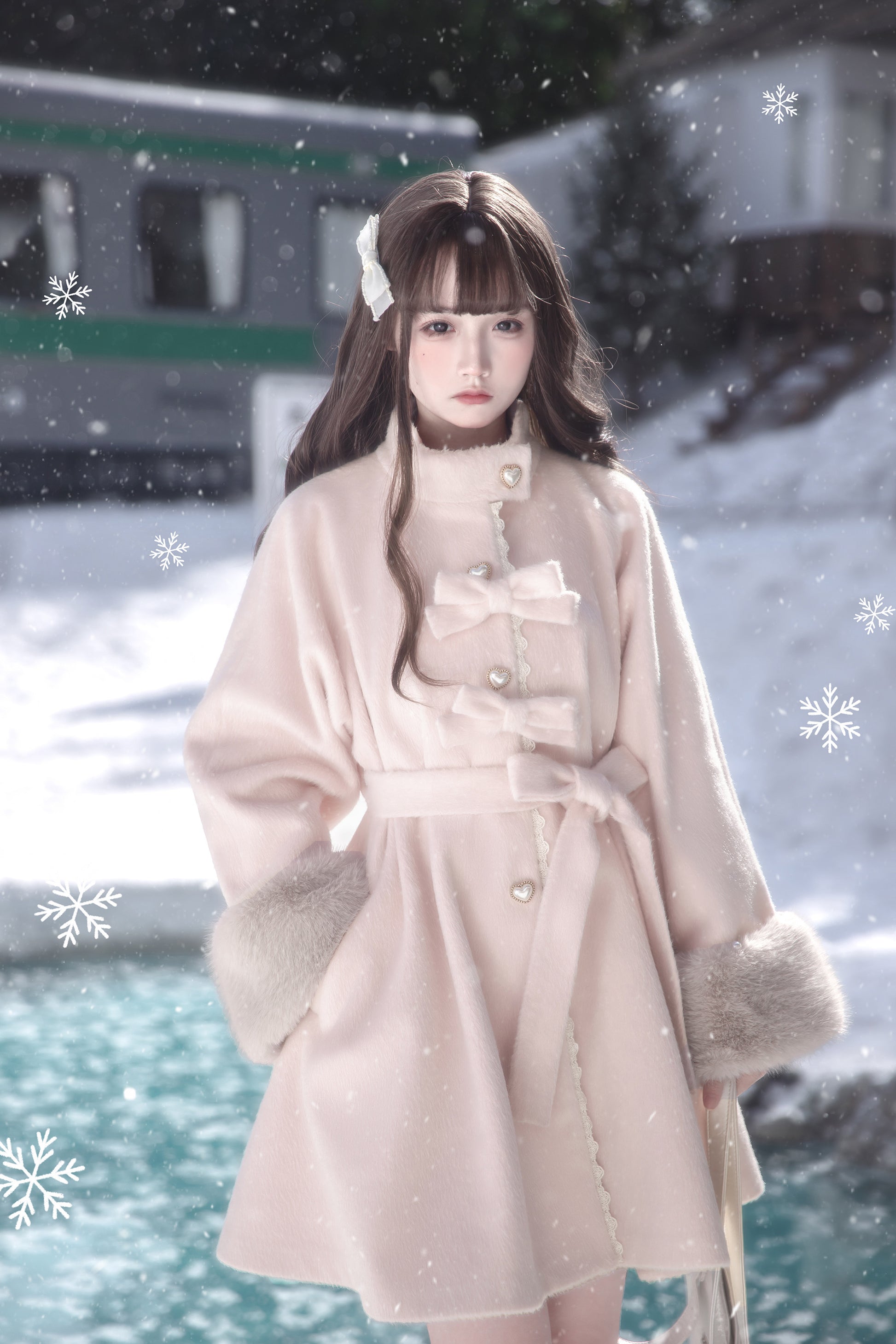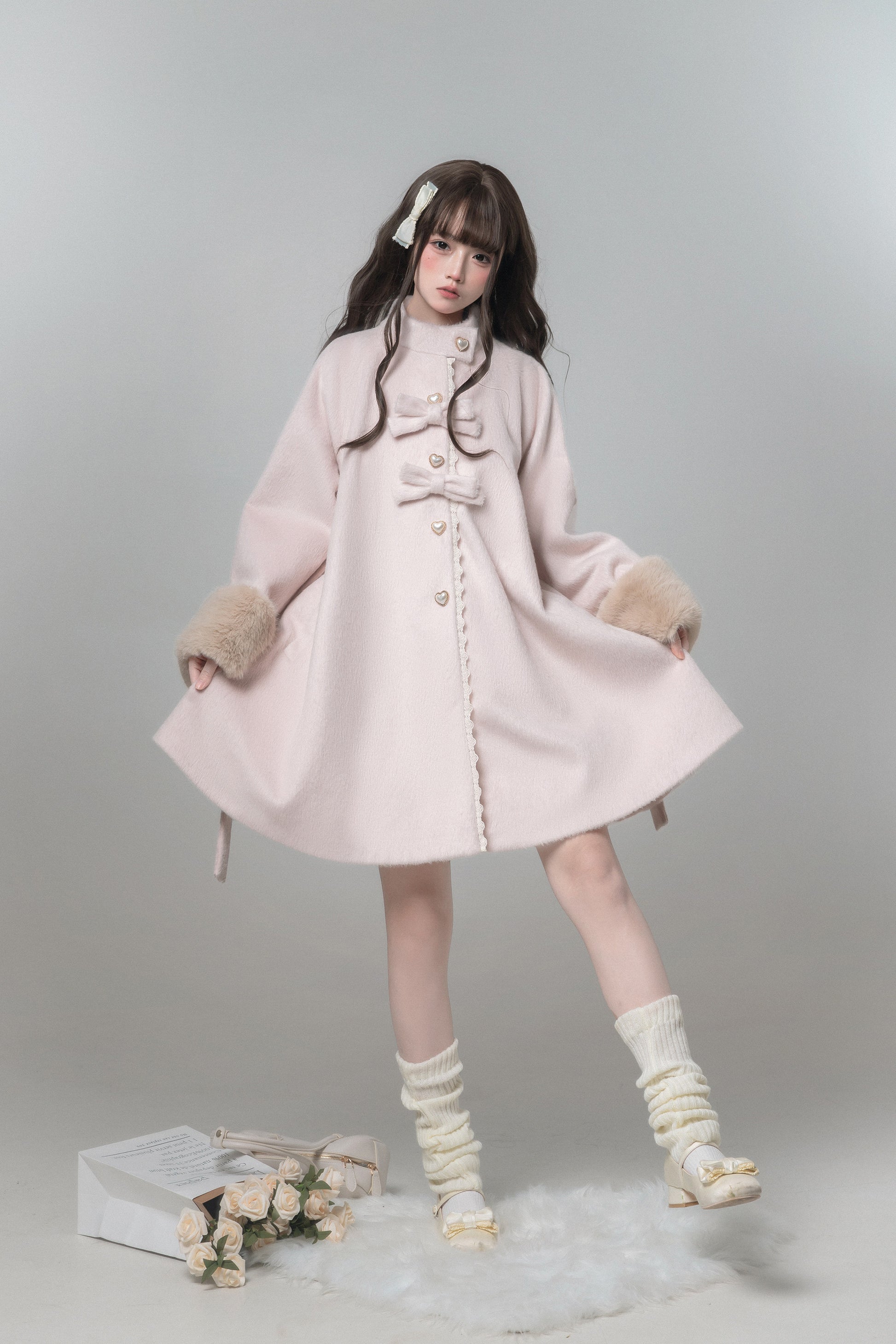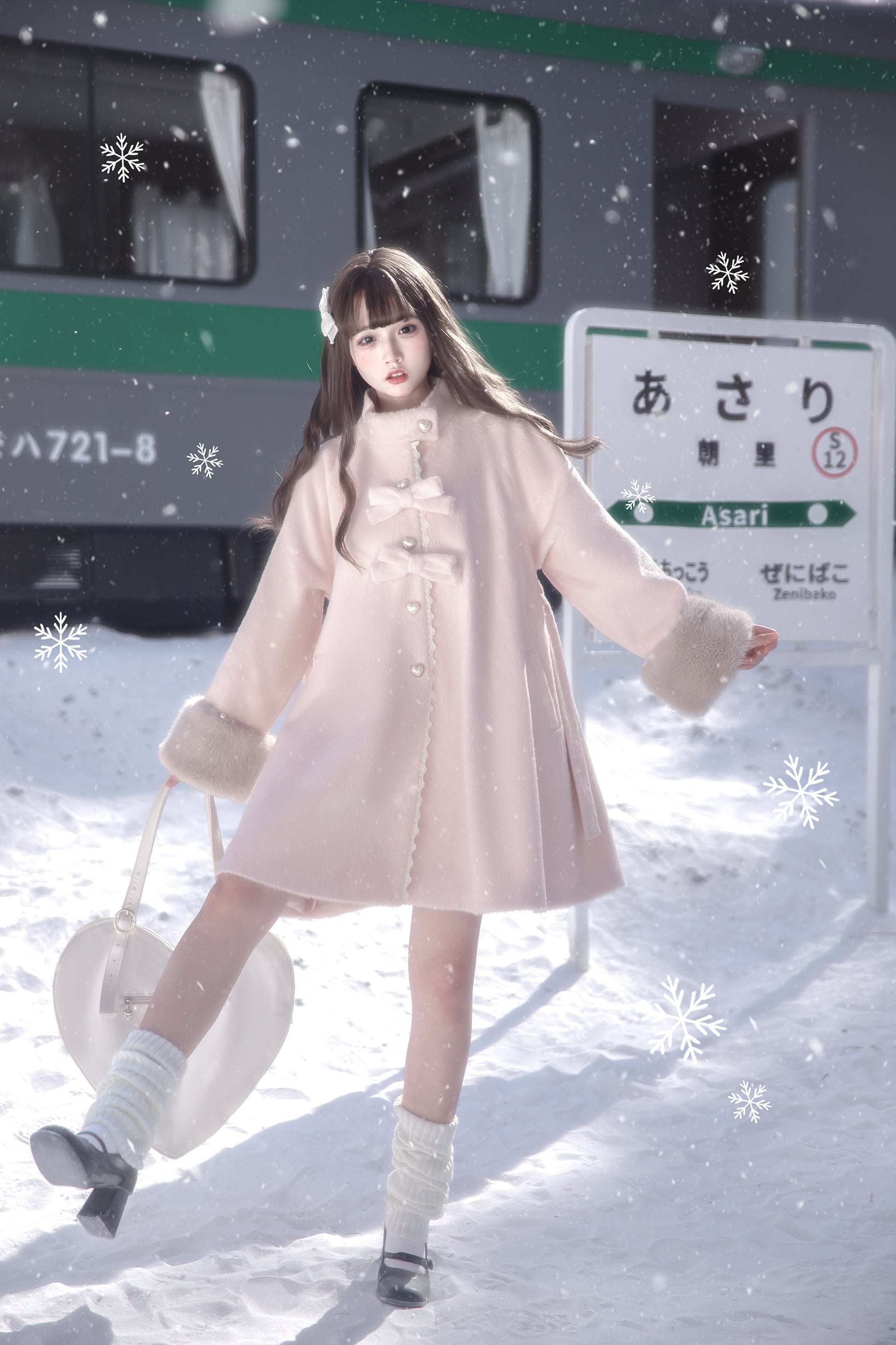 淡いピンクにリボン、ハートのボタンと可愛いが詰まったコート。袖口にファーがあしらわれて防寒もばっちり💕