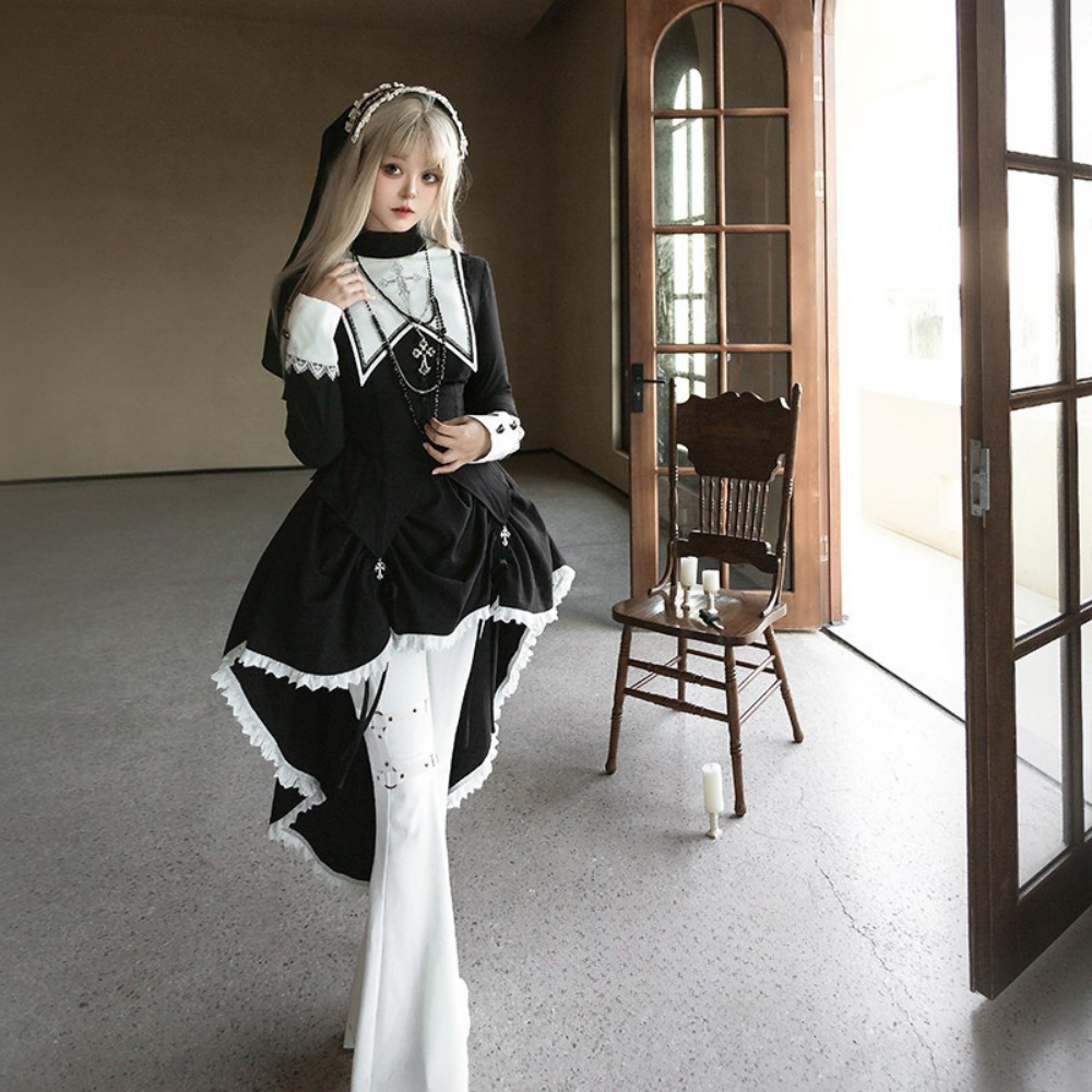 修道女コーデが完成するウィンプル(頭巾)とネックレス。