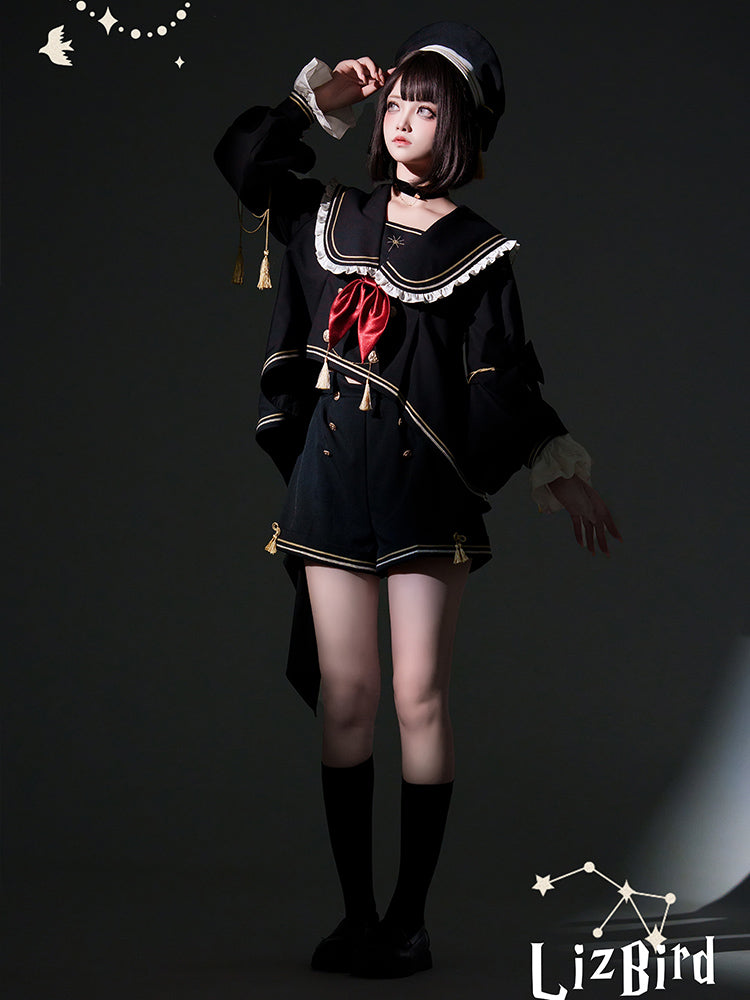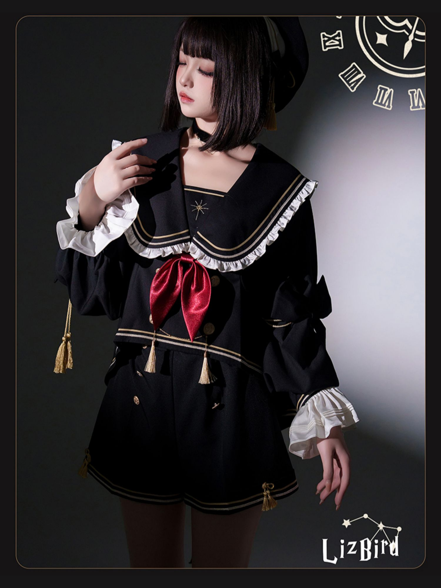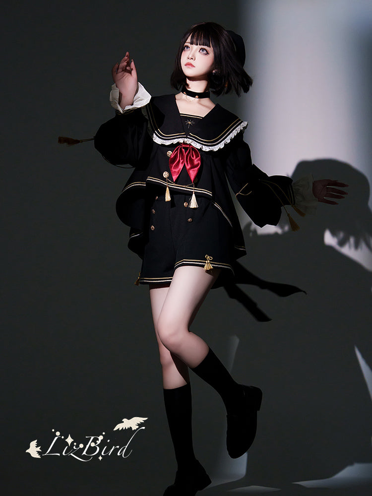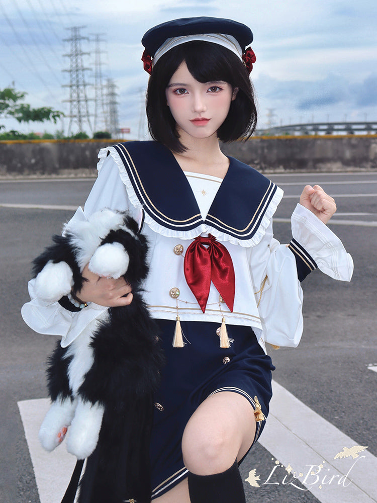 フリルのセーラー襟が水兵さんを思わせるセットアップ。