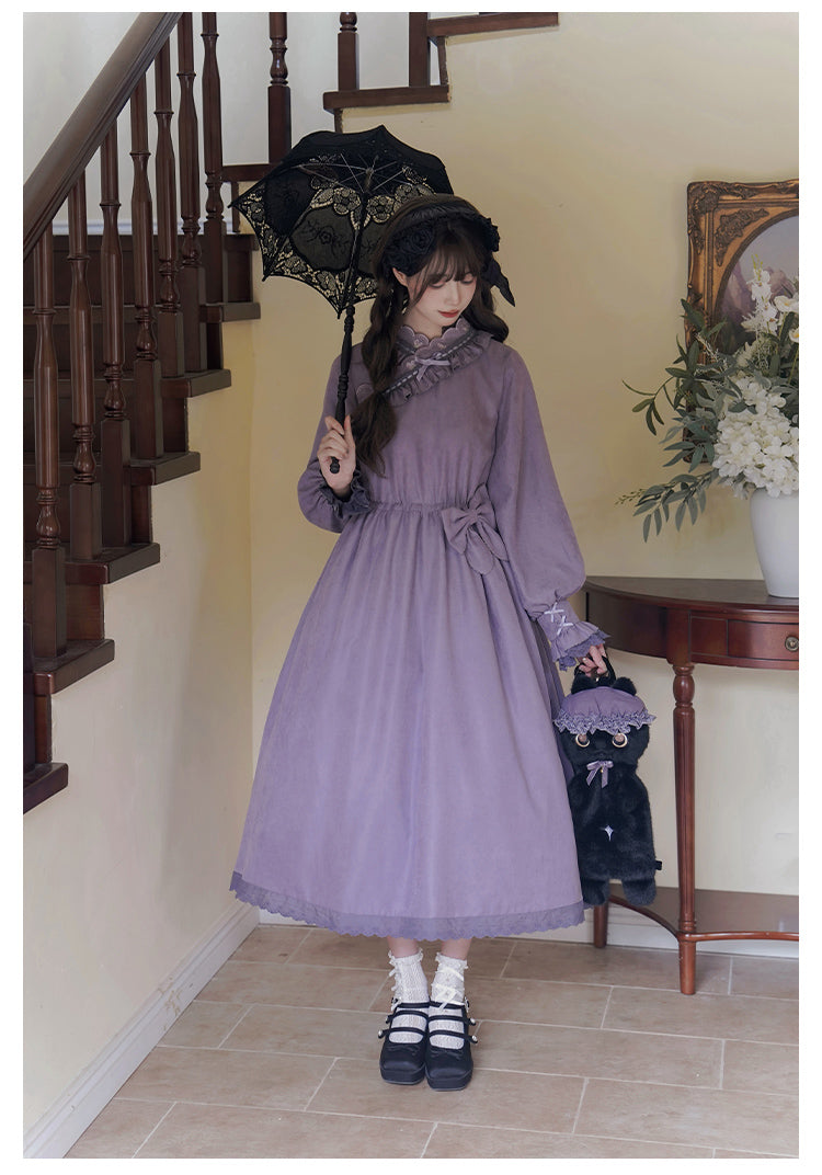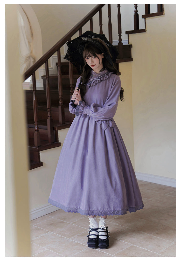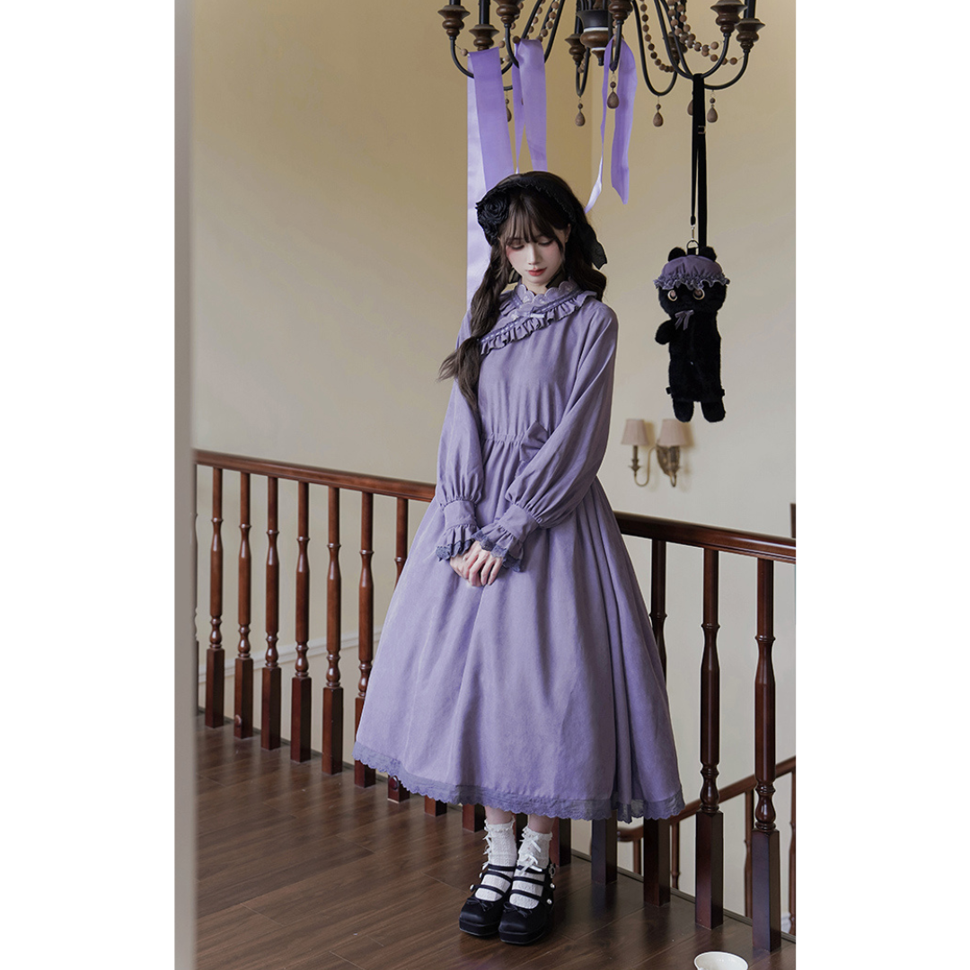 襟元や袖口のフリルがかわいいシンプルな長袖ワンピース。