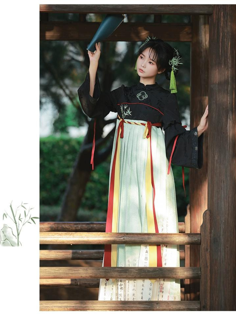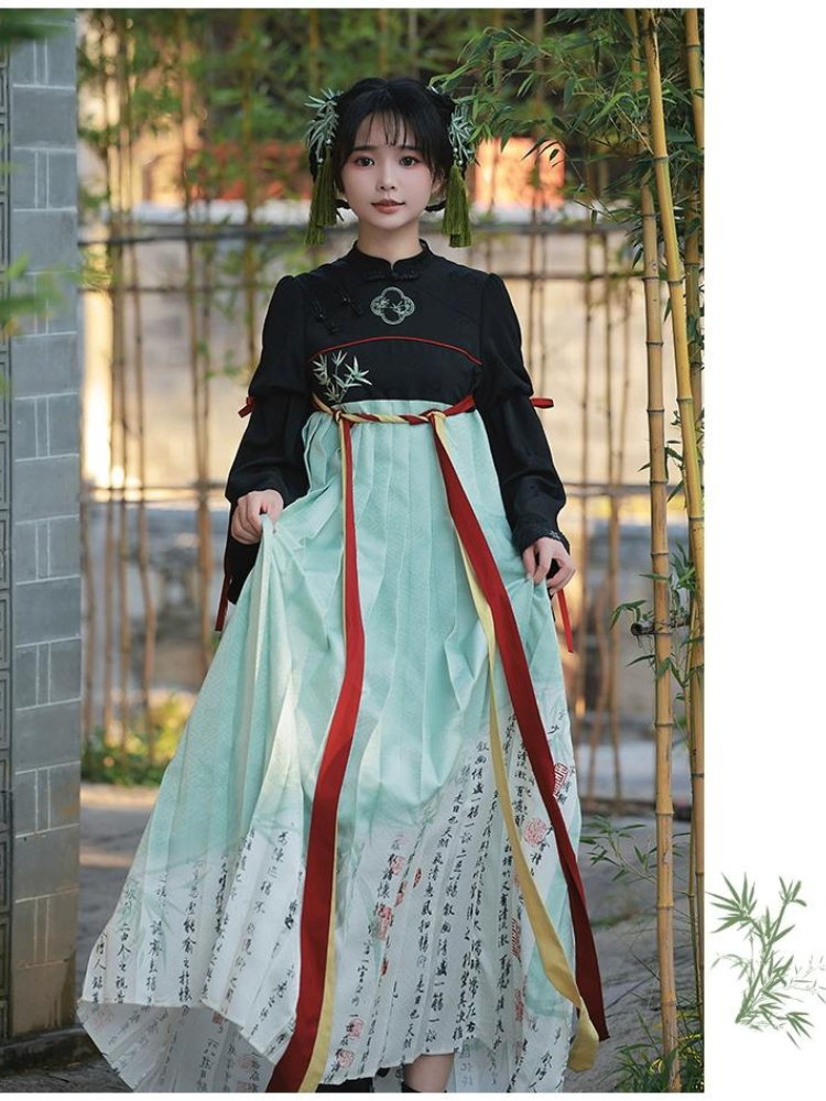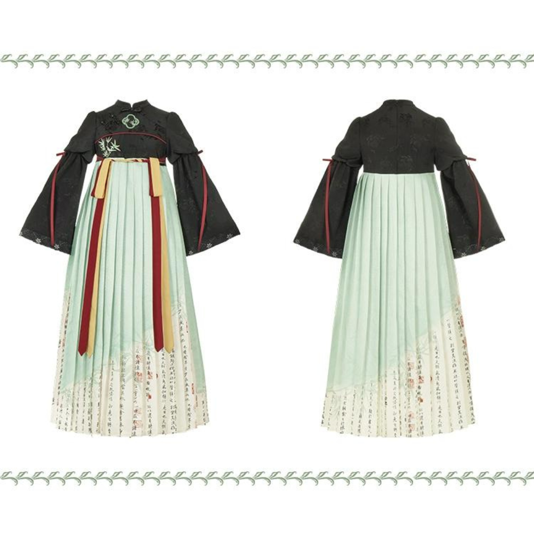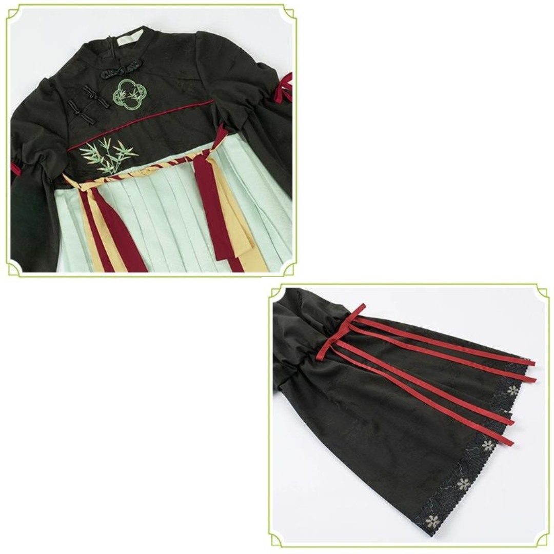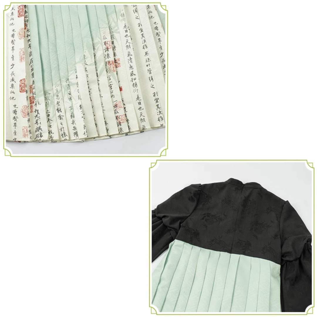 白緑 竹模様の漢服風フェイクツーピースドレス