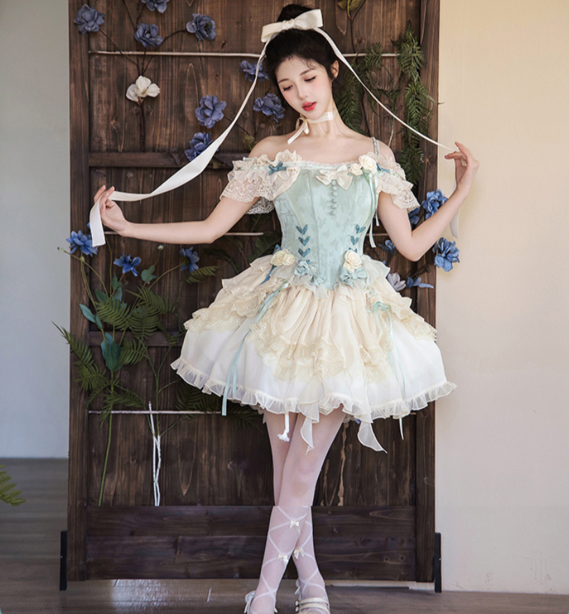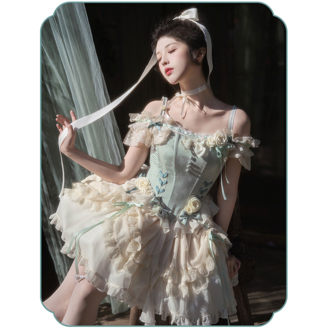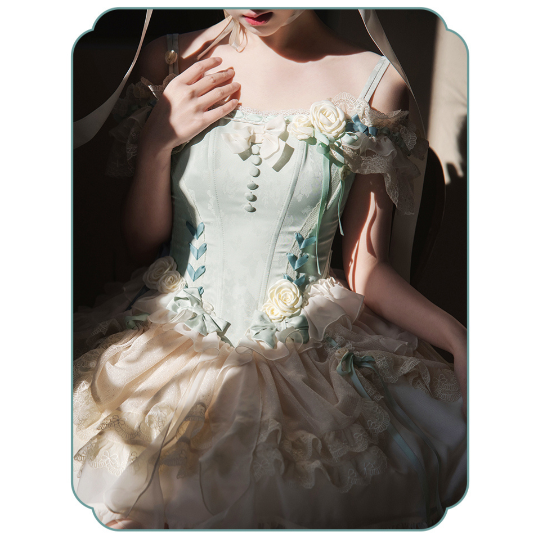 ライトグリーンの色合いが柔らかい印象を与えるバレエコアなジャンパースカート。