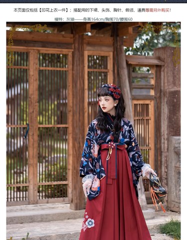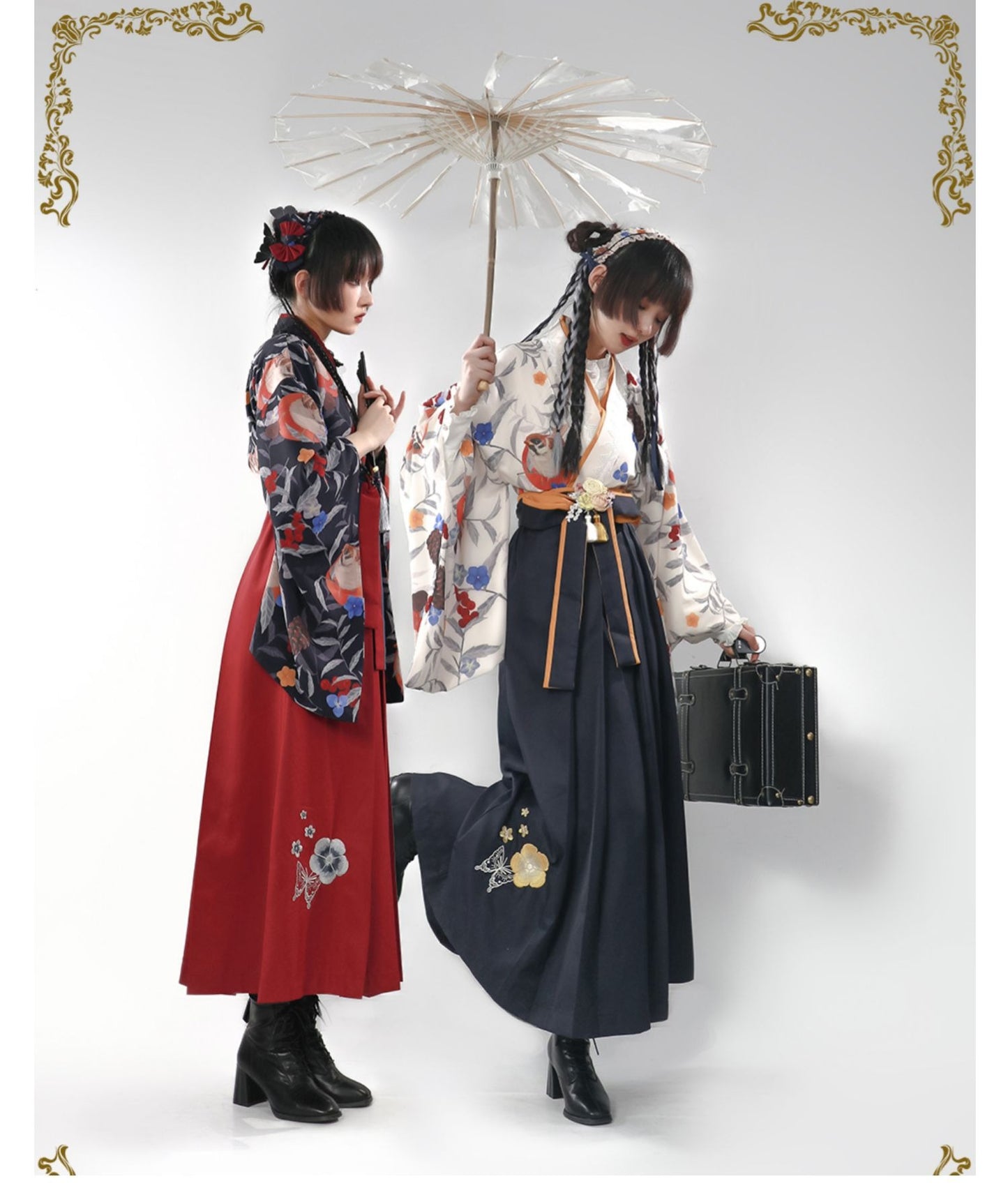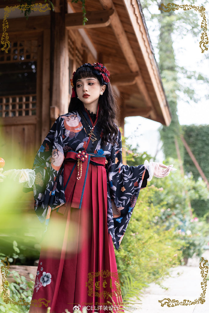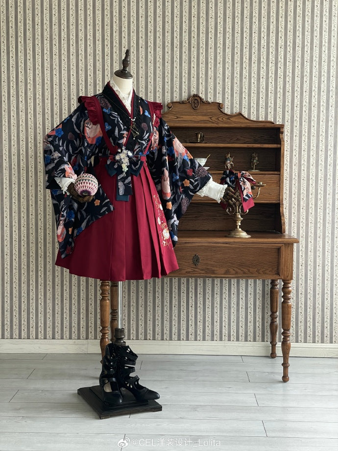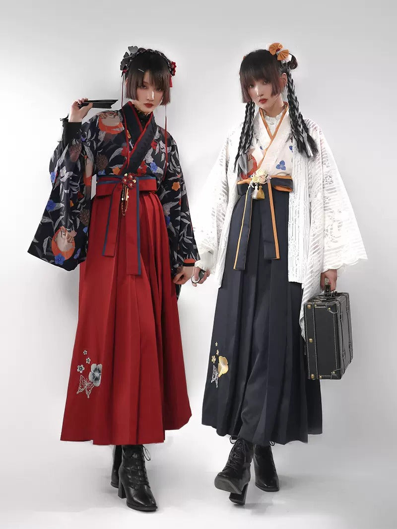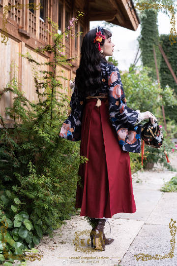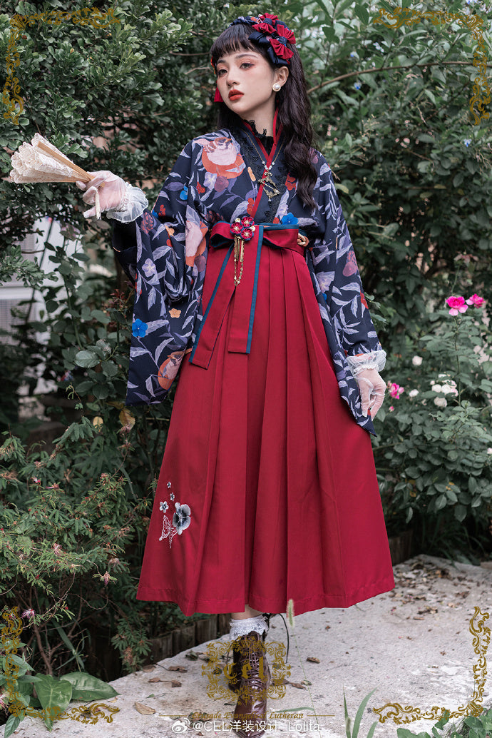 - 椿の花刺繍と蝶の袴風スカート/酒紅