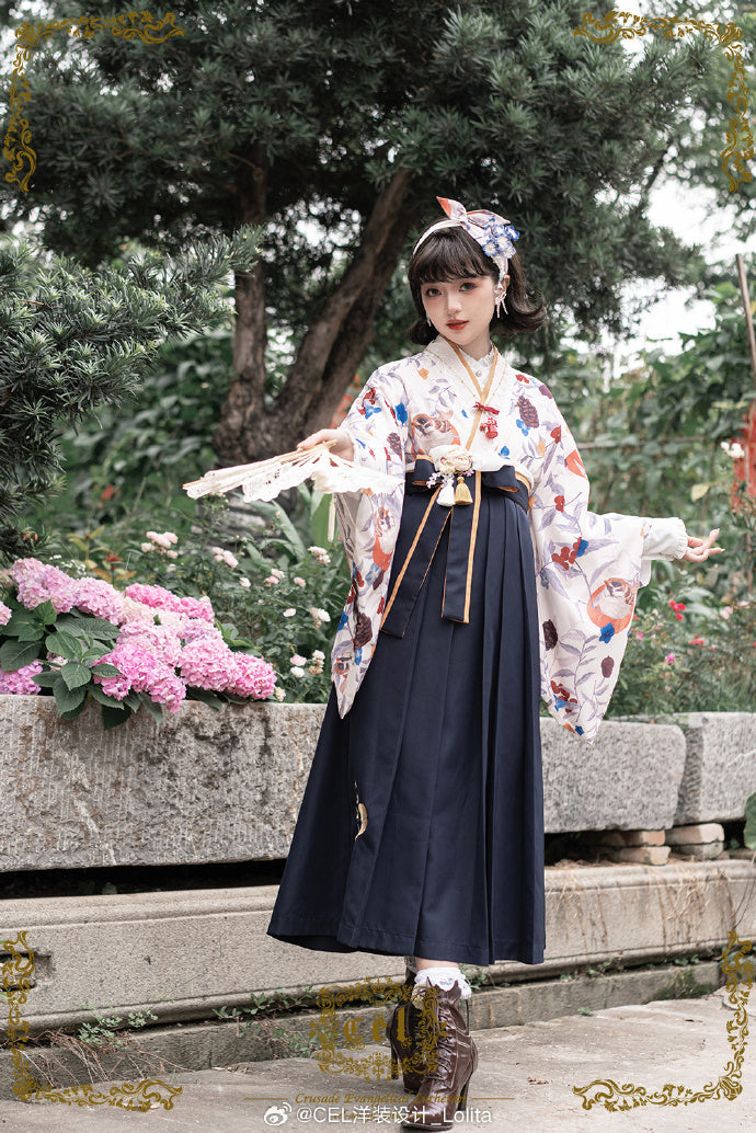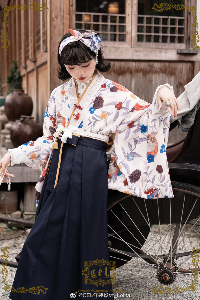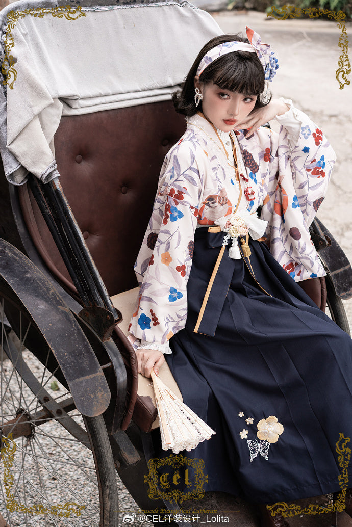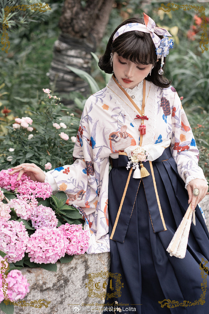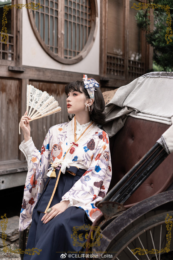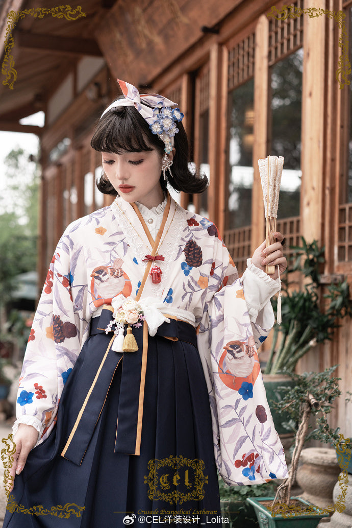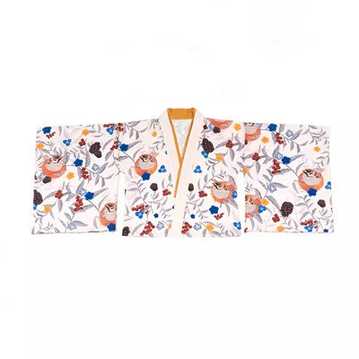 - 冬鳥プリントの着物風トップス/米白